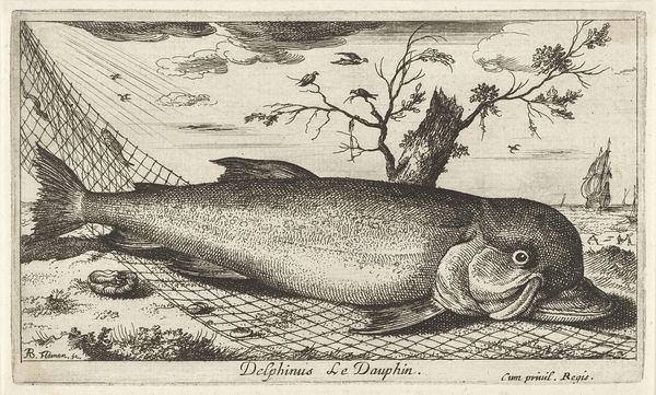 Editor: We're looking at "Three Burbots on a River Bank" by Albert Flamen, created around 1664. It’s an etching and engraving, a detailed print work of three fish. I find the composition almost sculptural, the way the bodies intertwine. How do you interpret the artist's choices here? Curator: The organization of form here is key. Flamen seems intensely focused on the graphic quality of the lines. Note the stark contrasts achieved purely through varying the density and direction of these engraved lines. There is minimal shading. The composition directs the gaze from the darker foreground and fishes to the river view in the background. The structure guides the observer's eyes using strictly formal qualities to organize the whole visual field. Editor: It's interesting how the linear quality gives it this sense of almost scientific illustration, even as it presents a natural scene. Do you see any symbolic value in the work? Curator: To analyze it formally, any symbolism is secondary to the rigorous design and precise rendering of the natural forms. While one might search for allegorical meanings in the Dutch Golden Age's fascination with the natural world, here, the structure, contrast, and pure rendering take precedence. Does the texture not compel you, how it builds up detail in the fishes' skin? Editor: Yes, now that you mention it, I appreciate the level of textural detail and the subtle rendering in monochrome; there is very little color to distract us from the composition of light and dark! Thanks, I will definitely try to consider these qualities more directly in my next study. Curator: Exactly, attend to the surface first! Examining art for what it *is* makes space to grasp more ambitious considerations later.