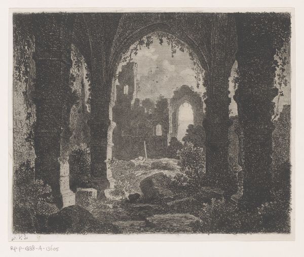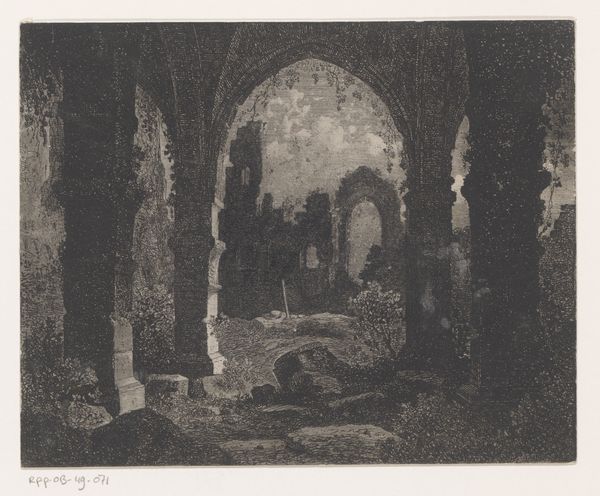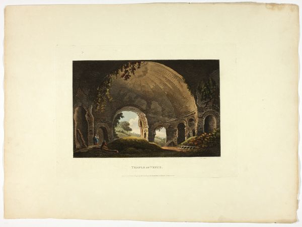 Curator: This is "In Villa Mecenate" by Albert Christoph Dies, dating to 1794. It’s an etching, an ink drawing, so let’s take a closer look. What strikes you first? Editor: This light! It’s theatrical, almost biblical in the way it hits those crumbling Roman arches. Ruin porn, but make it holy, you know? Curator: I see what you mean! It's as though time is collapsed in this one image: we have ancient architectural elements overtaken by nature, plus a rendering that embraces Neoclassical aesthetics. What feelings might have moved its intended audiences? Editor: For sure. The ruined arches evoke the passage of time, of course, a monumentality consumed and repurposed by nature. And those tiny figures... they really drive home that feeling of human transience. Like a Romantic's fever dream. It's wild to imagine 1794’s audiences reflecting on this. Curator: Precisely! Remember, it was created in the midst of vast social upheaval; it is possible this picture provided some type of reflection to Dies' contemporaries? Its symbolic charge must have been potent at the time. Look at the precision, particularly the lines which guide your eyes in specific spots... It could be interpreted as a conscious aesthetic choice intended to lead its spectators! Editor: Hmm, I am interested that there's also something reassuring about seeing beauty emerge from decay. Like a promise of renewal, almost! If the world has turned this beauty into rubble, then what will it mean? This feels right given how Neoclassicism reacted against the preceeding eras! Curator: I agree. I believe we tend to impose this understanding when reflecting on periods distant from us. That is also why engaging with the visual, even the seemingly simple, carries invaluable cultural insight. Editor: Well said! A brief but haunting exploration of time, memory, and beauty... etched in ink. Curator: Absolutely! It reminds me of that eternal dance between oblivion and rebirth, right here in Villa Mecenate.