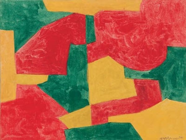 Curator: I find myself immediately drawn to the seemingly simple yet powerful visual dynamic unfolding in this abstract piece. What strikes you first? Editor: It's striking, a bit unsettling even. There's a visual tension between the shapes; the abrupt colour changes are unnerving in a way I didn't expect. Curator: It might interest you that this untitled work is by Serge Poliakoff. Best known for colour-field painting and abstraction, it displays an approach that leans into pure forms, devoid of explicit narrative. What might those colours represent in absence of a distinct storyline? Editor: Considering the shades used – primarily a vibrant red, deep green and clean white – one cannot ignore the connection to nationalist symbology, particularly in the context of post-war European identity. There is an intentional deployment of colour; they aren’t passive. What underlying emotional architectures is the artist intending to stimulate here, with such bold simplicity? Curator: It's fascinating how colour becomes the carrier of emotions that exist beyond language itself. You pointed out nationalism – consider also that geometric forms here aren’t about representation in a literal sense. They speak of hidden orders. The symbolic use of colour might access shared emotional landscapes; memories held in collective experience. What psychological spaces do they seem to create? Editor: To me, there’s something combative about it. This canvas becomes an arena of contrasting ideals clashing against each other; this boldness might have represented new ideological structures in Europe or maybe the fight between such constructs as they lost and gained traction with specific audiences, after decades of war and colonial policies. This artwork can also be seen as a call for new ideological interpretations that question the accepted standards. It creates both physical and intellectual space for this combat. Curator: So we see colour as an emblem but also perhaps a confrontation, which I suppose gives the artwork a certain potency. To think how an arrangement of shapes can be seen in the broader context of cultural change is remarkable. Editor: Yes, and perhaps that unsettling feeling comes from seeing unresolved tension. The questions these images stir seem as important as whatever answers they might attempt. Curator: Well, considering its wordless and abstract nature, these questions appear to invite active engagement for further reflection rather than closure, a shared cultural contemplation. Editor: Definitely; a colour-soaked space for inquiry, I believe.