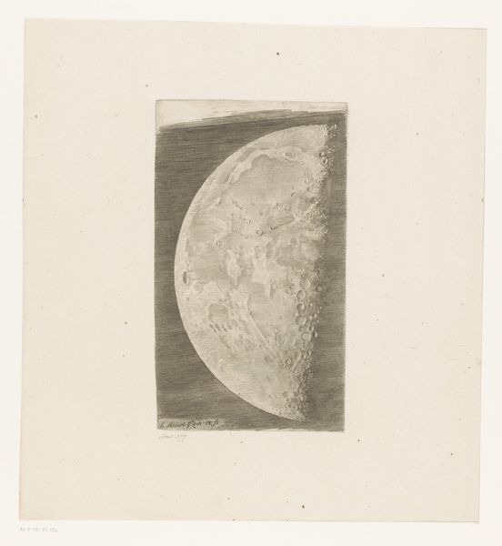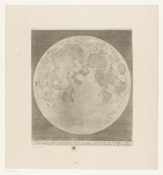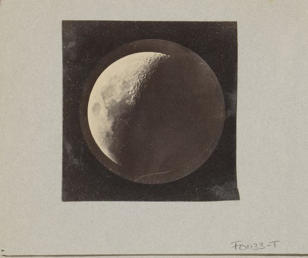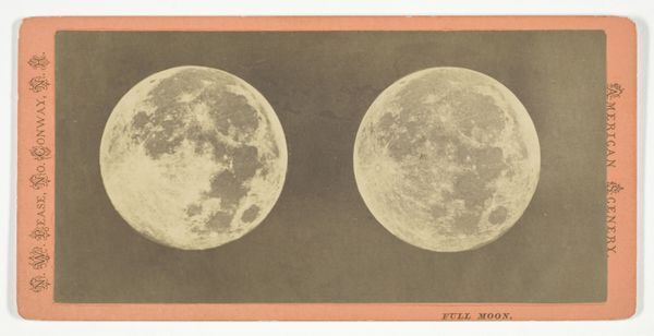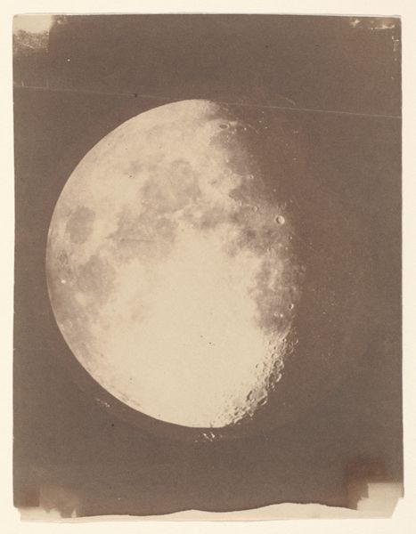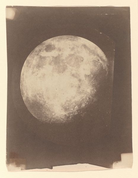 Curator: This gelatin-silver print from the late 1880s, titled 'Fotoreproductie van foto door Warren de la Rue van vlekken op de maan' depicts—well, it depicts the moon. Though it's a photograph of a photograph. Editor: The image quality almost feels beside the point, doesn't it? It's kind of a ghostly echo rather than a crisp lunar landscape. Still… compelling. A bit sad. Curator: Interesting you say that, "sad." Because the labor involved… someone carefully re-photographed a pre-existing image to…reproduce it. Think of the darkroom, the precise exposures…for something already documented. What does it mean? Editor: It means labor. Slow labor, yes. Methodical. It speaks to the burgeoning mass reproduction facilitated by photography itself. An old tech made older still through the new. It's layered that way. You have this raw, immediate subject… the moon…mediated through this intense, very material, almost craft-like process. Curator: The very dark, almost roughly applied borders definitely contribute to that feeling. A sort of… enclosure, emphasizing the isolation of the moon itself and, perhaps, even humanity's early attempts at understanding something so remote. Editor: Exactly! It's easy to romanticize the celestial, but this is fundamentally grounded. Consider the chemicals, the paper… things extracted and processed. To bring the moon down to Earth. We own it, now... or at least its image. Curator: I agree there's that act of ownership. But I keep thinking about light itself, captured in shades of grey and sepia… like memories fading into abstraction, constantly reforming, resisting permanence, forever circling our periphery like… well, the moon. Editor: Right. This image shows me the labor and economy tied into creating something reproducible that purports a “one-off” unique encounter – gazing up at the moon, to then possess it. An endless loop of needing the original yet, like a fading signal, needing its copies and recreations more and more. Curator: Mmm. And from my side I suppose I feel that yearning. But knowing it is already lost. What an art!