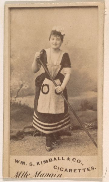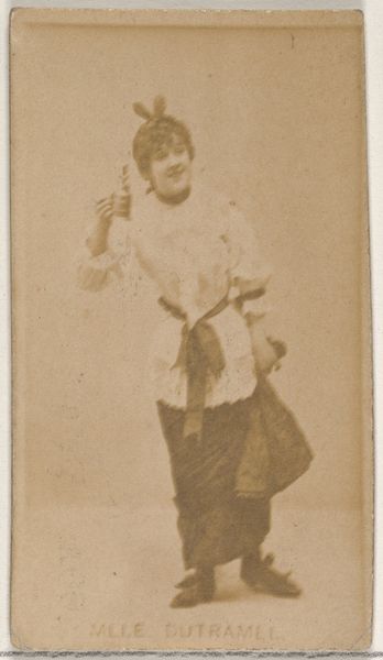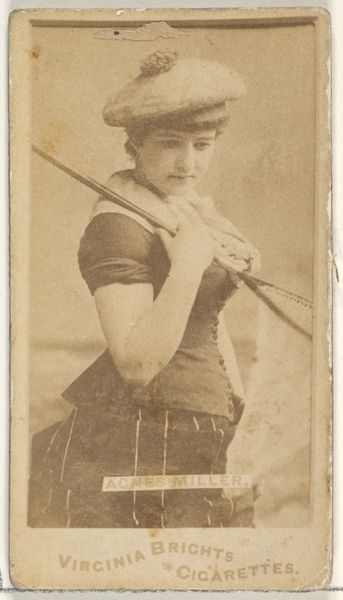 This is card number 84, Agnes Miller, from the Actors and Actresses series, a promotional cigarette card produced by W. Duke, Sons & Co. The sepia tone flattens the image, reducing depth and emphasizing the two-dimensional surface. The composition is divided into distinct zones: the actress in the foreground, the advertisement text above her, and a subtle background that blends into an almost uniform field. Agnes Miller is presented in a pose that suggests both strength and softness. The lines of the riding crop across her shoulders create a diagonal that counters the verticality of her figure and clothing, adding a subtle tension to the image. The use of photography here flattens and abstracts. The light and shadow define the form and contribute to the overall texture. The advertisement text is integrated as a design element which reflects the intersection of commerce and representation, questioning notions of value and authenticity within a culture of mass production. Ultimately, the interplay between form and function invites ongoing interpretation, highlighting how cultural values and artistic expressions are continuously negotiated and redefined.