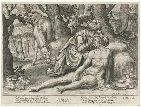 Pieter Serwouters created this print, Bacchus en Ampelus, using etching techniques. In this pastoral scene, the figures of Bacchus, the god of wine, and his companion Ampelus, are set within an Arcadian landscape. The narrative illustrates the story of love, loss, and transformation. In classical mythology, Ampelus dies tragically and is then transformed into a vine by Bacchus, commemorating their bond. Considering the historic preference for mythological subjects, the emotional depth of Serwouters' work is quite radical. It dares to explore themes of male love and grief within a context that often preferred heroic or moralistic narratives. The intimacy between Bacchus and Ampelus challenges the hetero-normative ideals that prevailed in art and society. It also brings to the fore the transformative power of love in the face of mortality. This print reflects how personal experiences and emotions can be woven into classical tales, enabling the exploration of themes that resonate deeply across time.