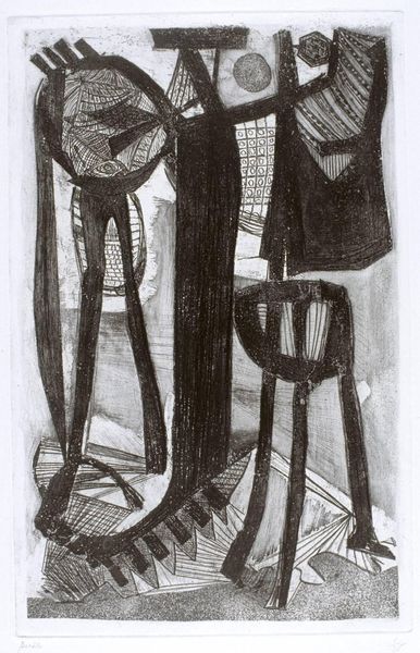 Curator: Here we have a work entitled "Mural" by Luis Dourdil. It appears to be rendered in pencil. What's your immediate take? Editor: Somber, very somber. The grouping feels…controlled, almost posed against those stark geometric forms. It evokes a strange sort of institutional feel for me. Curator: An interesting read, because that somber feeling connects directly, in my view, to what a "mural" traditionally signifies: public address, social commentary, a communal statement. Here, though, that feels subverted. The figures seem withdrawn, individual rather than unified. Editor: Absolutely, but I also can't help thinking about the process. All that pencil work to get this mural effect. It must have required patience and attention to craft the whole composition with simple graphite. There's something intriguing about choosing such an ordinary tool to create something with a monumentality about it. Curator: Yes, I am drawn to the artist's choice in material; a pencil work intended to be viewed as a mural gives a peculiar tension, and creates visual codes. Think about how pencils themselves have connotations; they speak to processes of learning, teaching, instruction, or record keeping. Consider this in light of that withdrawn communal affect you spoke of previously. I'm starting to wonder what collective cultural script they embody… Editor: And notice how that almost classical posing plays into the same theme. Even the shadows are rendered with such delicacy, but it all contributes to this strangely weighted presence, made entirely through the act of repeated material gesture. One single trace at a time building up this collective expression. It feels weighty but… fleeting? Curator: I think so. It seems to tap into cultural anxieties or maybe societal fragmentation. The very act of turning figures away suggests a deeper issue. What historical narrative is he trying to challenge with this symbolic reordering of the figures? It also feels open to endless interpretation given that we don't know the specific date for this image. Editor: Right, so what begins as a pretty traditional medium gets upended by process, ultimately producing something far from traditional both to experience and ponder. Curator: An artwork offering great depth from such subtle symbolic manipulation, and material construction, agreed.