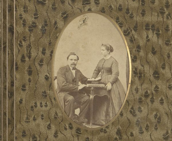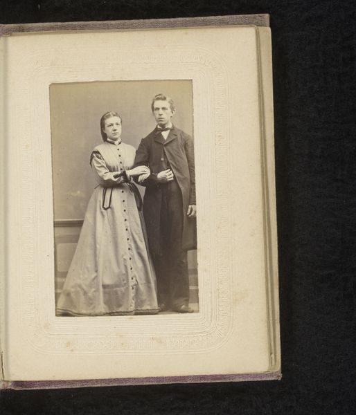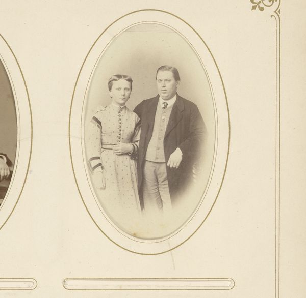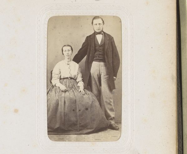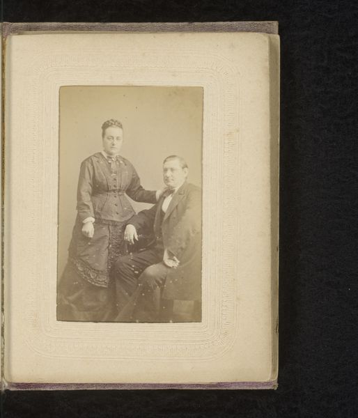 Editor: Here we have a photograph titled “Portret van een zittende vrouw en een staande man,” created around 1898-1900 by the Gebroeders Sanders. It has a somber mood, don’t you think? What symbols do you find particularly striking in this composition? Curator: Indeed, the formality strikes you, doesn't it? Notice how the man, standing, has a hand placed gently on the seated woman. This physical connection was deliberately employed. What emotions does this restrained gesture evoke for you? Does it seem intimate, possessive, or perhaps simply customary for portraits of this era? Editor: I’m not entirely sure… Intimate feels a bit of a stretch given their rather stiff poses. Curator: Stiff, yes, but think about how the conventions of photography dictated pose and expression. Lengthy exposure times demanded stillness, infusing the image with an aura of seriousness, but beneath the surface of social expectations, how might symbols like clothing styles and props communicate status, aspiration, or even unspoken emotions? Editor: Well, they certainly aren't dressed casually. Does their clothing offer clues about their social standing or even perhaps their personalities? Curator: Absolutely. The man's suit, the woman's dress, her jewelry…all act as symbolic markers. Beyond that, though, consider how the photograph itself functioned within the cultural memory. These images are echoes of individuals long since passed, prompting contemplation on temporality. What are your reflections as you examine this brief interaction between life and photography? Editor: It’s a window into a past we can never fully know, filled with tiny details holding deeper meanings. I learned that the photograph as an object carries historical weight. Thank you for your analysis. Curator: And for me, each discussion renews our links to those who came before and their influence through symbolism and objects, on those of us still here.