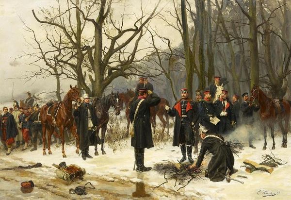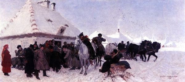 Editor: Vasily Vereshchagin’s 1895 painting, "On the road. Retreat and escape..." is awash in white, conveying a desolate, almost ethereal feeling. The long train of figures seems to trudge endlessly through a snowy landscape of war detritus. What symbols or historical echoes do you see in this work? Curator: The endless snow immediately speaks to Russia, doesn't it? Winter has historically been Russia's greatest defense, a harsh landscape that devours invaders. Here, however, it consumes Russians. Look closer at how the fallen weapons are buried under the snow—the potential for violence is suppressed, almost frozen in time, turning into artifacts, remnants of a painful event. How does the symbol of retreat speak to the painting's overall emotional tone? Editor: I see. It definitely reinforces that sense of loss, of something vital extinguished. The way the figures are presented, almost faceless and uniformly dark against the white, does that connect to anything specific? Curator: Indeed. Consider how the artist depicts the soldiers: reduced to silhouettes. It speaks to a loss of identity, the individual subsumed by the collective experience of war. The journey itself transforms them. But isn't it also the promise of something new? Do you find it more focused on ending, or beginning? Editor: I guess it’s both – a poignant image about endings, yet there’s a haunting persistence. The painting’s very existence is, in itself, a visual memorial to this moment in time, a journey recorded. Curator: Precisely! Through these symbols, Vereshchagin transcends a simple war scene. He presents a meditation on memory, loss, and the enduring impact of conflict on the human spirit and its land. What do you take away, after studying it more closely? Editor: I agree. At first, I just saw a winter scene, but I appreciate the cultural and emotional weight within this work of art. Curator: I feel like it carries the cultural memory forward into modern reflection, so well delivered through the enduring imagery, its visual encoding, that transcends language.