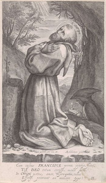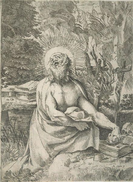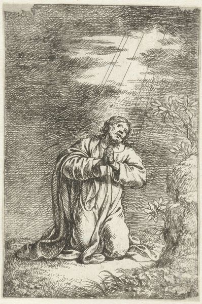 Curator: Ilya Repin’s oil painting, "Agony in the Garden," plunges us into a moment of profound spiritual turmoil. It's an interesting piece, wouldn't you agree? Editor: Absolutely. The first thing that strikes me is how visceral it feels, despite the rather traditional subject matter. The darkness practically envelops the figure. Curator: Indeed. Repin masterfully employs chiaroscuro, that stark contrast of light and shadow, to heighten the drama. The composition, though seemingly simple, hinges on a visual dichotomy—the earthly suffering below and the divine intervention above. The angel, almost spectral, appears to offer solace or, perhaps, a premonition. Note the cross and the chalice... powerful symbols within that upper register. Editor: Yes, the composition leads us there. I wonder about Repin's choice of oil, particularly. Its slow drying time allows for layering and blending, but also facilitates these very textural brushstrokes on the lower register, that appear almost muddied in places. Was that meant to indicate the labor of a craftsman with limited means? Or a comment about the toils of men? Curator: That’s insightful. Considering the prevalent artistic conventions of his time, one could infer Repin deliberately manipulated the oil paint to create symbolic undertones. The very physicality of the paint contributes to the overall sense of somber weightiness. And what about that single ray of light... isn’t it perfectly placed to draw the viewer's gaze directly toward the subject’s upturned face, highlighting the expression of anguish and supplication? Editor: True. And let’s not forget that deep background that can hint a labor camp with that window lighted by fire. Was this location where he saw his materials crafted? That would be really poignant considering this painting subject. All elements, from composition to materials, feel intertwined to tell a story that might not be only based on his beliefs but rather his life experiences. Curator: A provocative thought! Ultimately, the artwork's power rests in its capacity to evoke empathy and contemplation in us as viewers. Editor: I concur. Reflecting on this discussion, I now recognize a newfound appreciation for Repin's strategic selection of materials to deepen the significance behind his narrative choices.