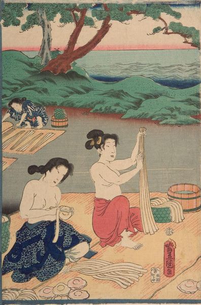 Editor: Here we have Utagawa Kunisada's "View of Ise Divers Processing Abalone" at the Harvard Art Museums. The divers are beautifully rendered, and the abalone harvest seems plentiful. What can you tell me about this woodblock print? Curator: Notice how Kunisada depicts the labor involved in abalone harvesting. We must consider the material reality, the diving, the collecting, the sorting – all intensive labor. How do the materials used in the printmaking process itself—wood, ink, paper—reflect the social context of production and consumption in Edo-period Japan? Editor: That's a great point. I hadn't considered the labor involved in creating the print itself, beyond the divers' work. Curator: Exactly. It blurs the boundaries between art and craft, prompting us to reflect on the social hierarchy and the value assigned to different forms of labor. What have you discovered? Editor: Thinking about the labor and materials involved definitely gives me a deeper appreciation for both the print and the divers' work.