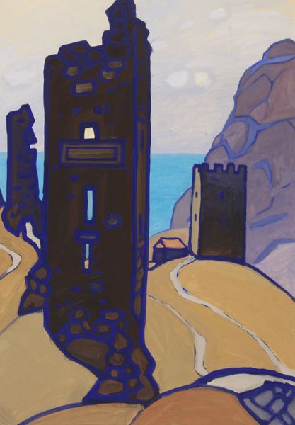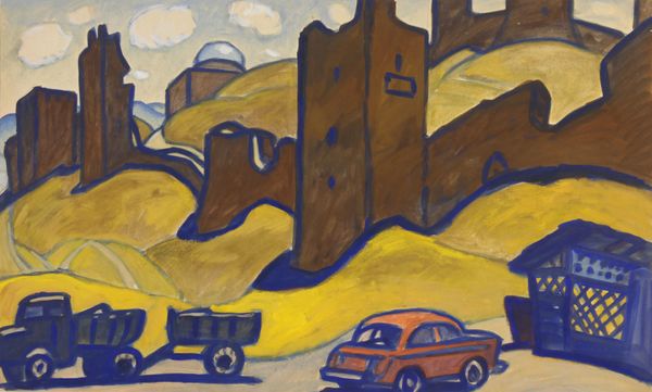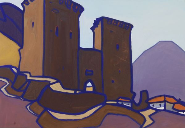 Editor: Here we have Yuriy Khymych’s 1962 oil painting, "The Ruins of the Genoese Fortress." I find its somber, almost monochromatic palette and blocky forms give it a very austere, monumental feeling. What do you see in it? Curator: The painting's formal qualities evoke a sense of stark monumentality. The artist's restricted use of color and the simplification of form guide us to observe the imposing structure as an object in itself. Notice the heavy blocks of pigment, their deliberate placement constructing mass and volume. Editor: I see that, it’s like he’s less interested in a realistic portrayal and more in the geometry of the fortress itself. Curator: Precisely. The strength of the composition resides in this almost brutal emphasis on structure. Observe how light and shadow don’t merely illuminate, but carve out the forms, creating a dialogue between flatness and depth. Do you think the texture contributes? Editor: Absolutely. The impasto technique—thick layers of paint—adds another layer of dimensionality and underscores the age, weight and permanence of the fortress. Curator: The solidity that Khymych captures. Considering this materiality, we observe not merely a ruin, but the visual essence of ruin itself. How do the angles play into this feeling? Editor: Good point! The stark verticality of the towers and the jagged edges create a dynamism that really heightens the sense of decay and imposing size, it seems. Curator: Exactly, those contrasting angles produce tension. So we have geometric form, a specific palette and varied use of brushstrokes. An interesting effect, wouldn't you agree? Editor: Yes, definitely! It’s taught me to really look past the subject matter and focus on how the formal elements create the overall impression.