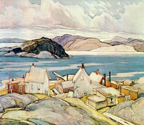 Curator: Let's consider Paul Henry’s “Keel, Achill,” completed around 1919. It's an oil painting capturing the Irish landscape. What are your immediate thoughts? Editor: A somber yet tranquil scene. The muted color palette creates a subdued atmosphere; everything seems toned down, as if reflecting a collective weight. The village itself looks hunched down against the land. Curator: That subdued quality is compelling, especially when viewed through the lens of early 20th-century Ireland. "Keel, Achill" depicts a community deeply rooted in its landscape yet burdened by its relationship to the British state. Notice the limited palette and heavy atmosphere mirroring the social climate. Editor: True, the structural composition is striking, too. The buildings huddle low, arranged geometrically against the curvilinear forms of the beach and the hills beyond, all united with those consistent brushstrokes. This formal contrast enhances the thematic tension. It's as if order is being imposed upon nature and culture. Curator: It can be also said the landscape is gendered as well. Early 20th-century representations of women and Ireland, a shared identity, are deeply intertwined. Think about the trope of Ireland being symbolized as a female figure, subjected to various oppressions. It could be argued that this artwork reflects this dynamic. The land, much like women's bodies at the time, carries this weighty historical and social significance. Editor: I follow your intersectional logic, but let’s examine that sea foam again. The dynamism, the texture – isn't Henry also concerned with the intrinsic beauty of natural forms? The brushstrokes create a feeling of constant flux, challenging any singular interpretation. Curator: Absolutely, it is both/and. Henry manages to imbue "Keel, Achill" with historical and social weight. How art acts as both a mirror to, and a space for reflecting upon social realities. Editor: Well said. I think this work really shows that how both formal and historical components blend into our unique experiences with a piece.