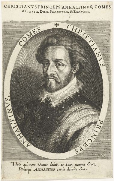 Curator: Welcome. Let’s focus on a striking engraving entitled "Portret van Paul Pfinzing". Experts date its creation sometime between 1643 and 1680. It presents a shoulder-up view of a distinguished gentleman. Editor: The figure appears weighted down by the very heavy armor he sports! His downward gaze seems… burdened. Are we to believe this armor conveys strength or oppression? Curator: This engraving is significant as it captures the likeness of Paul Pfinzing, a prominent figure during his time. Portraits like this served to immortalize individuals and project their status and affiliations. Note how the engraving includes descriptive text to solidify the sitter's achievements and societal standing. Editor: I do wonder how accurate these portrayals are. Isn't it also serving the needs of the ruling class and powerful elites by preserving their perceived status quo and legitimizing their authority? Curator: In terms of artistry, observe the engraver’s adept handling of line and tone. They give weight and depth to Paul Pfinzing’s armor. Consider also how strategic lighting can subtly convey character and emphasize key elements of the sitter's personality, like the chain and medallion that adorn his breastplate. Editor: Yes, and I think the artist here has leaned into that somewhat. The contrast definitely brings your eye to the wealth and stature conferred upon this man, not the labor it takes to uphold that social strata. Are we also reinforcing notions of inequality with art? Curator: Well, in that period, such portraits were often commissioned by those of a certain class. The image was very important, and it reinforced societal norms. Now it might seem oppressive or excessive. The artist’s engraving style is aligned with the Baroque aesthetic—its grandeur and realism appealed to a sophisticated clientele. The use of engraving ensured replicability. Prints made these images more widely accessible and contributed to Pfinzing’s lasting legacy, albeit one available primarily to literate circles able to read and interpret. Editor: Food for thought, definitely! So it’s also a reflection on who has access to these images and interpretations! Curator: Precisely. Ultimately, I find this piece a rich representation of not only Paul Pfinzing, but the world of societal hierarchies and the machinery involved in solidifying class stature and recognition. Editor: It does underscore how art exists at a fascinating intersection—simultaneously memorializing individuals and reflecting the era’s social frameworks of inequality that often still prevail today.