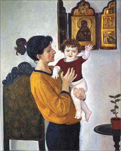 Boris Kustodiev made this painting of Y.E. Kustodieva with daughter Irina with oil on canvas. Look at that green wall, it’s not just green, it's alive! You can almost feel the texture of the paint, thick and layered, like he’s building up the scene, one stroke at a time. It’s like the paint itself is part of the story, part of the moment. The brushstrokes are so loose and free, especially in the background, yet the composition is so carefully considered. I’m drawn to the way he captures the light on the little girl's face, how it makes her skin glow. And then there's that dark dress, almost swallowing her mother whole, yet somehow it feels protective, like a cloak. Kustodiev seems to be in conversation with artists like Vuillard, but with this particularly Russian flavor. You can really feel the connection between the people in this piece. It’s like he’s saying, "Here, look, this is what matters."