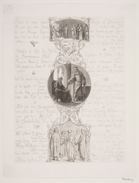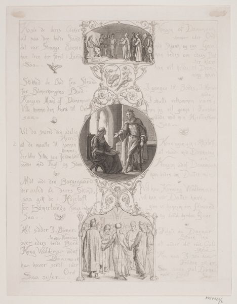 Curator: This engraving by Lorenz Frølich from 1863, titled "Illustration nr. 4 til "Visen om Dronning Dagmars ankomst til Danmark"", which translates to "Illustration No. 4 to 'The ballad of Queen Dagmar's arrival to Denmark'", beautifully encapsulates a romanticised vision of Danish history. Editor: It’s intricate, isn't it? The detail, particularly in the faces and drapery, evokes a quiet solemnity, a pre-Raphaelite melancholy despite being a ballad illustration. The whole composition has the air of a manuscript illumination, which positions the legend in a clear lineage of cultural representation. Curator: Indeed. Frølich's work emerged during a period of intense national romanticism in Denmark. This piece wasn’t just illustrative; it was instrumental in shaping and solidifying national identity, imbuing historical events with a certain emotional tenor that resonated deeply. Editor: So it is both artistic and political work. How were women viewed at this time, and in what way did Queen Dagmar play into these beliefs? I'm also curious to know what kind of sources Frølich drew upon, given that romanticism itself constructs imagined pasts through selective aesthetics and narratives. The depiction of Dagmar here is so sentimental, even angelic. I have a hard time seeing this as anything but a patriarchal interpretation of her existence. Curator: Well, the historical Dagmar—or Markéta of Bohemia—was indeed reimagined in popular imagination. During Frølich's time, there was an effort to elevate figures like her as models of idealised femininity and national virtue. By the 19th century, she represented values like piety, gentleness, and sacrifice, conveniently fitting the era’s gendered expectations. The engraving and related verses function within this context to cement a national myth and propagate very specific beliefs about the ideal woman. Editor: I see your point. Placing Frølich’s illustration in relation to the performance of gender and cultural identity opens a window onto a complex historical framework that continues to evolve to the present day. That makes it worth further discussion, even today. Curator: Absolutely, especially as this artwork exists not just as an aesthetic object, but as an active participant in broader conversations about history, memory, and cultural meaning.