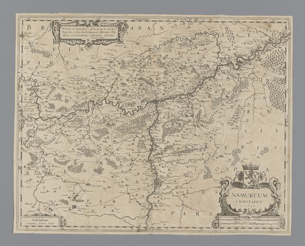 Curator: Here we have an intriguing map, “Kaart van het Overkwartier van Gelre,” an engraving that offers a bird's-eye perspective of a portion of the historical Duchy of Guelders. It dates from around 1644-1680 and is held at the Rijksmuseum. Editor: It looks incredibly precise, yet somehow fragile. The lines are so fine. I wonder about the paper itself – what it was like when new, what processes of making contributed to the aesthetic that we're viewing today. Curator: Indeed. The materials would have been meticulously prepared, reflecting the importance of cartography in asserting political and economic power. And if we look closely, we see symbolic elements: small illustrations of buildings to mark cities, perhaps gesturing toward their prominence. Editor: Yes, these aren’t merely geographic renderings; these are representations of authority. Think about the skill needed to transfer knowledge onto copper or a similar material. Who trained them and were their tools common for their period? The labor really shifts my perspective. Curator: The creation of such maps also reflected a specific worldview, mapping not only physical space, but also the perceived order of the world. Notice how dominant the river is. It creates a linear structure through the territories represented here, evoking trade and strategic access. Editor: Water is so key for resources, right? The rivers connect things while serving as a border; power and practicality exist at the same time. Did the commissioners or rulers want the people of their territory to view their surroundings in this exact, visually unifying way? Curator: Absolutely. Maps served as instruments of control. Their circulation created a shared, yet controlled understanding of geographical and political space among different groups. What seems merely informative is loaded with power. Editor: Precisely. Considering the material, and its distribution: did it affect land ownership? Trade routes? Or even the simple navigation practices of everyday lives at all societal levels? The ripple effect is fascinating. Curator: It's a powerful lens through which to see history and the relationship between material culture and psychological landscape. Editor: By analyzing the material execution, it enhances how the work existed in the Dutch Golden Age, a unique time where people interacted and functioned. It shows how maps became, more than their apparent intentions, things.