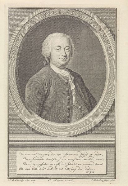 Curator: Jacob Houbraken created this work in 1776. It is entitled, "Portret van Henricus Johannes Folmer" and is currently held in the Rijksmuseum collection. Editor: Well, first impression - it's quite reserved. The texture feels almost brittle, given what looks like aged paper. A sense of formality pervades it, something about the careful linework and the oval frame. Curator: Yes, the oval framing is a classic compositional technique for portraits from this era. Houbraken’s meticulous pencil work creates a fascinating interplay of light and shadow. The cross-hatching gives depth, especially noticeable in the subject’s coat. We must note, though, how this object as well as those who are depicted exist within a deeply political time. Editor: Absolutely, though from a purely visual perspective, the subject's gaze is interesting. It is quite direct and somewhat challenges the observer, inviting closer scrutiny. Also, this style of engraving became incredibly popular to reproduce portraits, allowing the general public to have access to imagery of popular leaders. Curator: Indeed. And speaking to its historic context, this engraving allowed for the wide dissemination of Folmer's image—Folmer, himself a figure of some consequence. This illustrates art's crucial role in shaping public perception, doesn’t it? Editor: Undeniably. By virtue of this widespread availability, engravings such as these offer fascinating insights into the relationship of portraiture with celebrity. Curator: Houbraken’s attention to detail, though, pulls us back into a formal reading of this particular artwork. Notice the minute textural variance he achieves with simple pencil strokes – a tour de force. Editor: I agree; the medium certainly dictated the aesthetic and, considering this portrait as part of a larger visual culture reveals much about social hierarchies and values in that era. This object also makes clear that an artist such as Houbraken served a clear purpose in that climate. Curator: Examining this work highlights the crucial need to acknowledge not only artistic talent, but also the function served by that talent within socio-political landscapes. Thank you. Editor: Thank you; I hadn’t considered the broader reach of what on the surface is simply a serviceable portrait.