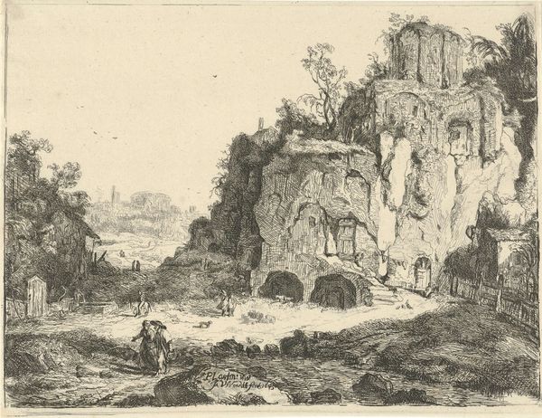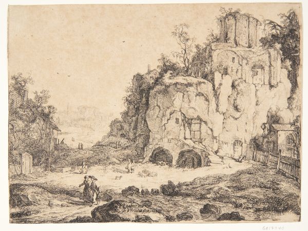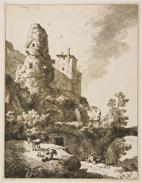 Christian Wilhelm Ernst Dietrich created this landscape with ruins using etching. Notice how the composition guides the eye upwards. Beginning with the resting shepherd and his flock at the base, a broken bridge then leads to a towering, ruined structure. Dietrich’s use of line is particularly striking. The dense, chaotic strokes in the foreground gradually transition to finer, more controlled lines, giving the illusion of depth and distance. This technique not only creates a sense of space but also hints at a deeper commentary on time and decay. The ruins, rendered with meticulous detail, are not just architectural remnants; they are signs of past grandeur, symbols that invite reflection on the transience of human endeavor. The sky, filled with swirling lines, adds to the sense of impermanence. It suggests that the natural world endures, outlasting human creations. The landscape isn't merely a visual scene, but a carefully constructed representation of historical and existential themes.