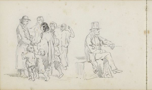 Curator: This intriguing pencil sketch, "Figuren op straat," whose title translates to "Figures on the Street," comes to us from the hand of Johannes Abraham Mondt. The artwork's date spans from 1869 to 1941. Editor: The immediate impression is of a fleeting moment, a stolen glance at a scene quickly sketched in a personal sketchbook. The tilted lines and scrawled figures definitely gives off that personal, from-life type of observation. It has the same sort of captured transience like those daguerreotype street scene photographs. Curator: Indeed. Observe the composition; Mondt employs a rather loose hand, rapidly defining the figures with subtle cross-hatching. It is evident Mondt leverages implied lines over crisp form to convey mass and space within the tableau. Semiotically, what inferences can we glean of street life simply via suggested visual cues? Editor: A band leader after a concert, perhaps, or an ice cream seller with his family, or, wait a minute, a group of tourists and a guard? And they are all standing right here in front of me... It almost seems as though the image comes straight out of the corner of a theatre or a lively public space from around that period. Is that an accurate feeling for the real period from where the art comes from, or my own projections based upon personal nostalgia? I am always curious of what’s the relation between feeling and history, as both mingle like street dust and our personal emotions Curator: Interesting proposition; and I am convinced one could read so much into this little drawing... it begs consideration, whether he intentionally obscured their visages or opted simply for gestural abstraction when defining his characters as visual signifiers, for an expressionist goal. Editor: A guard and those children! And maybe even the mother behind! Even now they pass right here close to the museums around the garden. Funny the ways time seems to converge—the streets from the sketch merging into today's urban fabric... You know? It's interesting, right? Curator: Time, indeed. Through line, light pencil work, and an open-ended narrative frame, Mondt leaves us contemplating the quotidian, its intrinsic aesthetic potential, and temporal reverberation.