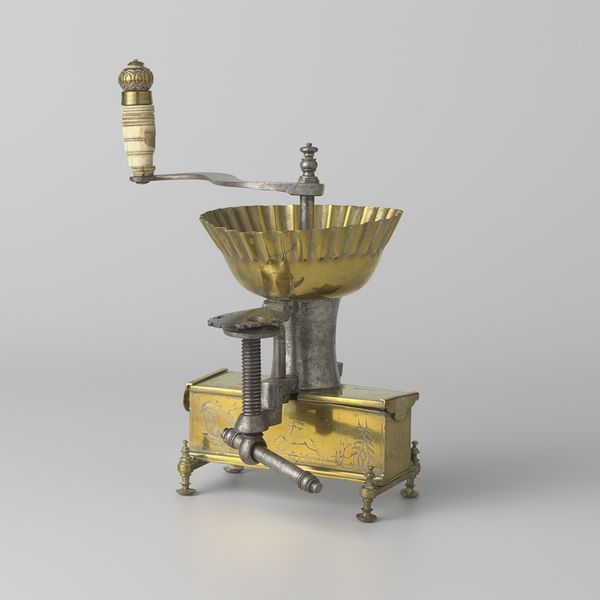 Editor: This is Theo Nieuwenhuis's "Inktstel van messing en tropisch hout," or brass and tropical wood inkstand, dating from before 1910. It feels so ornamental, almost precious, given its everyday function. What strikes you when you look at it? Curator: Well, isn’t it something? It takes me back to a time when even the most mundane objects possessed an inherent artistry, an almost theatrical presence. The art nouveau flourishes, that lovely dance between metal and wood... it whispers of leisurely correspondence, of thoughts carefully considered before being committed to paper. I wonder, though, did Nieuwenhuis ever pause to consider the carbon footprint of shipping that tropical wood? Probably not, eh? Does the piece spark anything else in you? Editor: The details are incredible, especially the contrasting geometric patterns. Was there a particular fascination with mixing materials like this at the time? Curator: Absolutely! There was a real yearning to elevate everyday objects, a kind of democratic impulse in design. Brass and wood were favoured, offering that satisfying contrast of warmth and cool, texture and sheen. And those geometric patterns, they echo the broader art nouveau movement’s embrace of stylized natural forms. Each element fighting for attention, but settling peacefully into one exquisite composition. Did our friend Theo ever get a papercut, I wonder? It's so tactile. Editor: It makes you want to write a letter, doesn’t it? It seems that art nouveau strived to add grace to every facet of living. Curator: Exactly. And perhaps remind us to find beauty and intrigue in unexpected places. Almost makes me want to dust off my fountain pen! I love the potential this art piece carries: writing and beauty. What a magnificent blend!