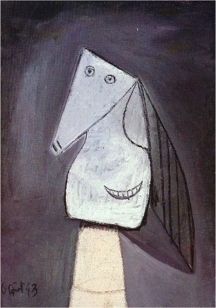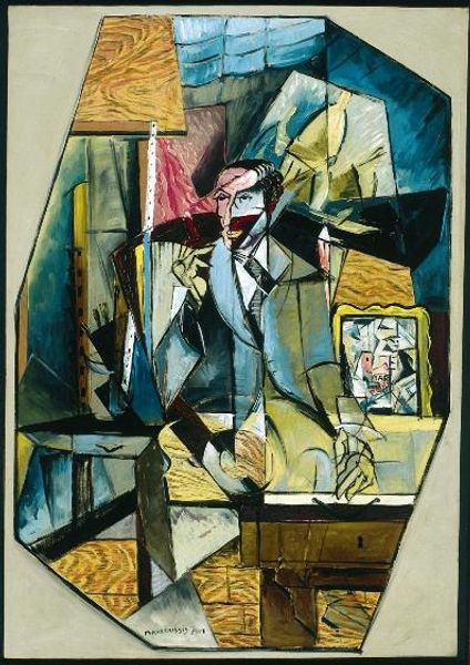 Editor: This is Bertalan Pór’s oil painting "Mihály Károlyi" from 1930. It's... striking. There's something almost unsettling about the figure's gaze and distorted features. What kind of symbolism can you unpack in this work? Curator: The monocle, for instance. It's not merely an accessory; it signifies vision, not just in the literal sense, but intellectual and social perspective. The choice to depict Károlyi, a significant political figure, with this exaggerated lens hints at a critical, perhaps cynical view of leadership and societal vision. Does it feel like a magnifying glass focusing on flaws? Editor: Yes, especially given the already heightened expressiveness of his other features—the color of his skin, even the way he's leaning on the surface next to him. The whole thing has an anxious energy. Curator: The expressionistic style serves to amplify the emotional weight. Pór isn't just painting a portrait; he's capturing the inner turmoil, or perhaps projecting a societal anxiety onto Károlyi. Notice the stark contrast between light and shadow—aren't they emphasizing this internal conflict? Editor: Absolutely. I didn't initially consider the light. But, looking again, it seems to sculpt a feeling of isolation, doesn't it? Curator: Precisely. The cultural memory embedded here speaks of a period of political upheaval and uncertainty. Consider the historical context—the interwar period—a time ripe with disillusionment. Pór is using Károlyi as a vessel to communicate broader anxieties about power, perception, and the future. What would you say is the emotional residue after considering this piece? Editor: A deep sense of unease, but also a compelling invitation to look beyond surface appearances and question established narratives. Thank you! Curator: A potent piece of cultural commentary indeed! It's been illuminating to delve into its layers with you.