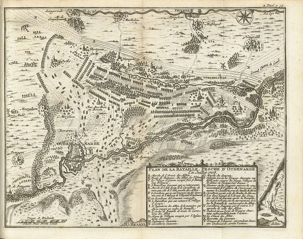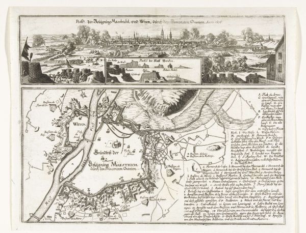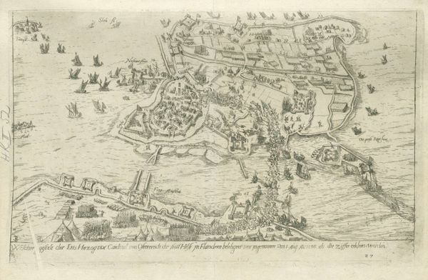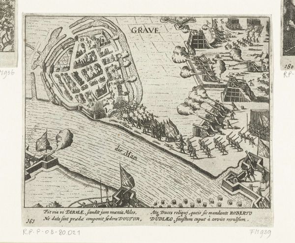 Editor: This engraving, titled "Verovering van schansen in de omgeving van Groningen, 1593" by Frans Hogenberg, depicts a landscape view. It's incredibly detailed, almost like a map, and it gives a strong sense of the military actions taking place. How should we interpret this work? Curator: For me, it's compelling to see this image as a record of material production – both the physical objects represented and the engraving itself as a manufactured artifact. Consider the copperplate: mined, processed, and then meticulously etched by a craftsman. How does this lens shift your initial impression? Editor: That's fascinating! Thinking about the production, the act of engraving translates power and resources. It highlights the tangible effort involved in documenting and perhaps glorifying military conquest. The very lines are a testament to labor. Curator: Precisely! The choice of printmaking, too, democratized access to information, enabling widespread circulation of this specific perspective on the conflict. And what about the materials being deployed within the depicted conquest itself? Editor: So, it's not just the *representation* of war, but the materiality of war, right? Like the fortifications, weapons, clothing... it all speaks to available resources and their deployment for strategic dominance. Curator: Absolutely. Reflect on the social context: who commissioned this work, who consumed it, and what political messages were intended? Think about its use in propaganda. It's not just an artwork but a material object actively shaping historical narratives. Editor: It changes everything, viewing this not just as art but as a consciously crafted piece of media, made with specific materials for a defined purpose and audience. Thanks for making me aware of the importance of considering the processes of labor. Curator: Exactly. Remembering that artistic creations are rooted in real-world materials and contexts deepens our appreciation. This approach connects aesthetics to the messy realities of history and labour.