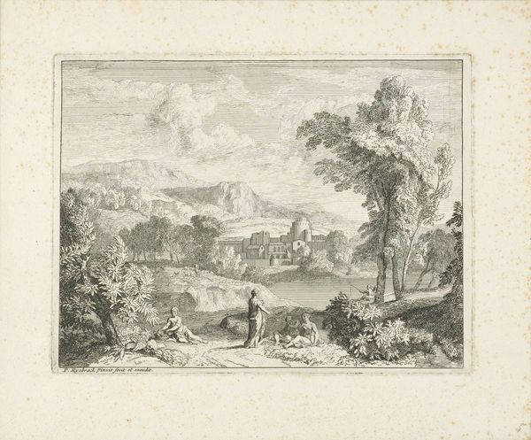 Editor: So, this is Isaac de Moucheron's "Landschap met twee rustende figuren op de voorgrond," likely created sometime between 1697 and 1744. It's an etching, which is neat. It strikes me as kind of… idealized. A really picturesque scene. What stands out to you when you look at this? Curator: Well, firstly, "picturesque" is spot on! It’s very deliberately composed to evoke a feeling, isn’t it? You’ve got those classical figures lounging in the foreground, framing the idyllic landscape beyond. It’s a Dutch Golden Age take on Baroque landscape painting. I find it’s less about representing a real place and more about constructing a sort of fantasy of nature, right? Editor: Totally! It's like a stage set almost. A constructed escape. Curator: Exactly. Notice how the light catches the peaks of the distant mountains and draws the eye upward, leading the viewers' gaze through this fantasy? Think of it like an invitation... Where do *you* imagine it’s inviting you to? Editor: Hmmm… toward tranquility? It seems to be pushing toward the idea of a calm life, maybe? Sort of "come and rest" kind of energy? Curator: Indeed. What's more fascinating is the subtle tension Moucheron creates between the natural world and these classical elements; the Roman ruins fading away with time! Editor: That makes me think differently about those lounging figures… almost like they’re pondering the passage of time or something! It went from "nice escape" to a lot more thoughtful now. Curator: Precisely! The Dutch Golden Age landscapes were so smart, weren't they? Making it appear casual and beautiful when it's much deeper than what you see initially. This talk reminded me to explore similar artists more, I'm going to explore this a bit! Editor: Same here!