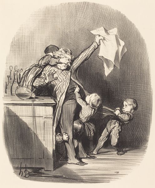Honoré Daumier, with his characteristic skill, presents us a scene of domestic role-play, sketched in lithograph, where a child mimics the mastery of horsemanship, typical of the haute école tradition. The most striking symbol here is the whip—a diminutive hand wields it, echoing the historical dominance asserted through equine control. Consider how this small figure, brandishing the whip, recalls images of emperors and generals atop their steeds. Yet, the stage is set not in a grand arena, but amongst scattered toys. This juxtaposition evokes a psychological space where the child's subconscious merges play with the primal assertion of power. The simple act of play becomes a cultural echo. This image resonates deeply within the collective psyche, stirring memories of control, discipline, and the complex dance between power and innocence. It is an exercise in recollection, as this symbol of domination resurfaces in the innocent mimicry of a child's game, transformed yet still potent.
