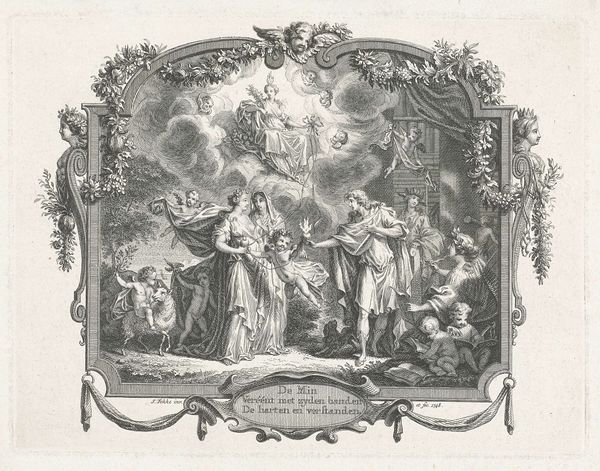 Curator: What an arresting image. Immediately, I am drawn to the dramatic contrasts. The light almost vibrates off the page. It's a complex piece, quite ornate for a simple landscape. Editor: It feels...theatrical, almost staged. That piercing sun and those frolicking cherubs practically guarantee some kind of allegorical intention, don’t you think? It looks like something that might appear on a theater curtain to me. Curator: Indeed. This is *Berglandschap met stralende zon in ornamentele lijst*, or *Mountain Landscape with a Radiant Sun in an Ornamental Frame*, dating from the period 1683 to 1733. The artist is Bernard Picart, and the medium is engraving. Editor: Picart has a playful hand with his rendering of details. I mean, look at how delicately the cherubs above the frame are modeled, compared to the dramatic rendering of the distant landscape. Almost cartoonish next to deeply etched mountains, what do you make of this contradiction? Curator: The ornamental elements carry echoes of both classical and baroque ideals. We've got the figures referencing classical antiquity alongside a Baroque-style landscape contained in a very linear frame. Those contrasts likely symbolize a tension between earthly and divine ideals, a popular conceit in history painting from this era. And as you pointed out, it creates that lovely theatrical feeling. Editor: So it's not *just* pretty scenery. All this points towards layers of cultural context baked right in, doesn't it? So, looking at the radiant sun and mountains, what emotions would this have likely sparked within viewers from this period? Hope? Awe? A subtle commentary? Curator: Yes! Consider also the radiant light, a visual cue recognized across many cultures, carrying associations with divinity and enlightenment, illuminating a landscape rendered with considerable detail. People likely viewed it through both theological and humanist lenses, pondering humanity’s relationship to the divine in nature. And it may have also triggered colonial attitudes, with those cherubs essentially blessing "newly-discovered" territories! Editor: A loaded image, as is so often the case, once you know where to look. I appreciate that Picart blended a familiar scene – a sunny landscape – with symbolism layered on top to make this engraving stand out. Curator: Absolutely, the engraving presents us with familiar motifs of cultural power, continuity, and creativity. And just as significantly, it raises new questions each time it meets a different audience across time.