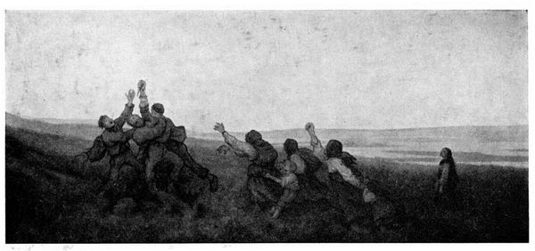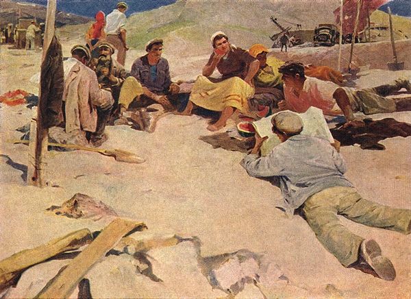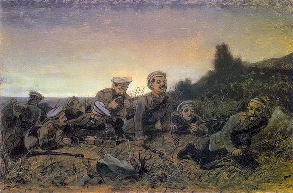 Curator: I find myself drawn to the rather somber mood conveyed in Vasily Perov’s 1874 painting, "Scouts at Sevastopol." There's a dampness in the air, a pervasive tension amongst the soldiers, all captured with such understated skill in oil on canvas. Editor: Yes, it certainly captures a specific historical moment. Perov painted this after the Crimean War, which ended in 1856, a conflict deeply entwined with Russia’s identity and imperial ambitions. This work can be viewed as a commentary on the costs of war, and what the soldiers might have had to sacrifice in the name of empire. The composition suggests it is an experience, almost cinematic, rather than just a war painting. Curator: Absolutely, and consider how Perov subtly nods to these themes of empire. The gaze of the central scout is defiant and searching as he strains his neck. He embodies the complicated intersections of duty and maybe disillusionment after such a siege, and as a man placed directly in the midst of violence. What does that violence exact from the self? Editor: And the surrounding landscape reinforces the tension. It’s bleak and rugged, and could act as another 'character' itself. Notice the barren quality to it. But if you look closer, the eye also spots smaller delicate features that add a feeling of unease rather than peace, an interesting formal juxtaposition. We might consider the tradition of Romanticism here: war expressed via sublimity in the sublime vastness, nature as this formidable opposing force, that these soldiers face, too. Curator: That reading gives further complexity and context to the soldiers themselves. They almost become allegorical in the face of Romantic tropes. To read this now through intersectional lens, you wonder what their backgrounds are and what they were made to feel complicit with within the War itself. Are they even afforded that interiority? How might different identities amongst this landscape change perceptions of the soldiers entirely, if, for example, we apply contemporary discussions around intersectional power? Editor: Indeed. Perov, as an artist working in the Realist tradition, does focus our attention on these figures within a recognizable historical context, encouraging reflection on both past and present narratives around conflict, gender, and the legacy of imperial expansion. Curator: Precisely. This painting offers a rich lens through which to examine not just historical events, but how social and power dynamics continue to shape artistic expression and our understanding of it today. It allows us to question and probe deeper than the first glance, expanding a rather silent but powerful moment, outwards to engage further, with our own social commentary on violence and visibility today. Editor: It seems such paintings like “Scouts at Sevastopol” serve as critical reminders that the past remains deeply intertwined with the present. It challenges our accepted understandings of how historical social issues are being re-examined by art practices, new scholarship and theory today.