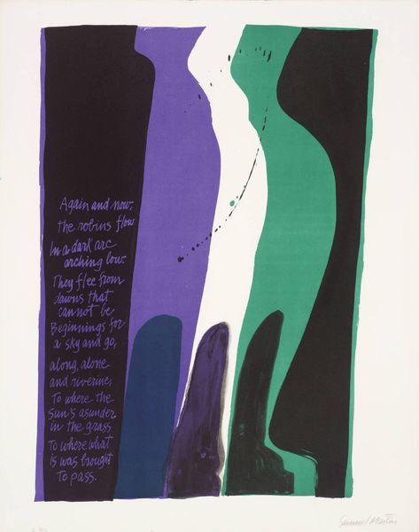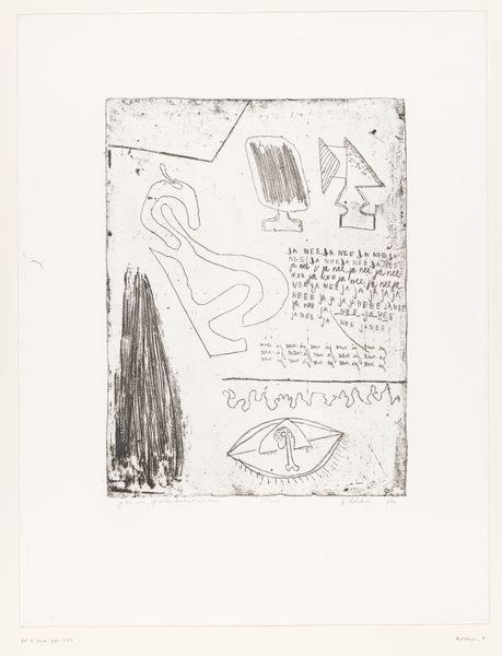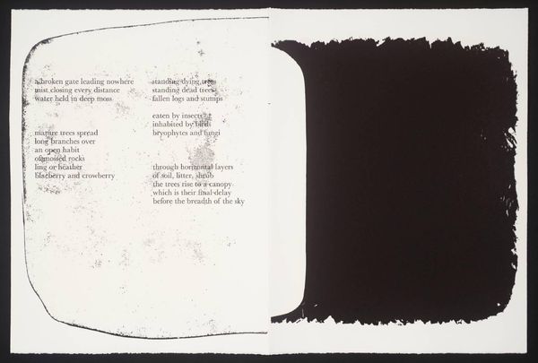 Curator: This piece by Ian Breakwell, created without a title in 1979, layers a stark image reminiscent of religious iconography over a fragment of text. It’s a bit like a visual poem, isn't it? What leaps out at you? Editor: It feels… oppressive. The stark contrast, the Pieta-like figure, combined with that stream of consciousness text…it's heavy. How do you interpret that tension between the visual and the written? Curator: I think Breakwell is pointing towards the suffocating weight of history, of the stories we tell ourselves. The image suggests suffering, while the text hints at a kind of detached observation of the everyday, almost banal, world around it. Are we all just numb witnesses? Editor: So, it’s less about religious suffering and more about the suffering of… indifference? I hadn't considered that. Curator: Perhaps. Or maybe it’s about the way we frame suffering, package it, even. Makes you wonder what we choose to see, and what we ignore, doesn't it? Editor: Definitely gives you something to think about. Thanks!