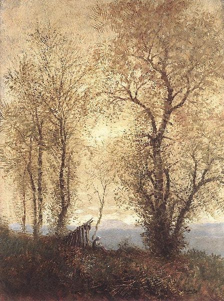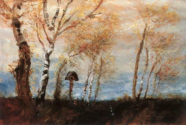 Curator: What a delicately rendered scene. We are looking at Kateryna Bilokur's watercolor, “Autumn," painted in 1960. Editor: My first impression is of quiet fragility, a muted landscape holding its breath before the onslaught of winter. The watercolor lends itself beautifully to that sense of impermanence. Curator: It is quite affecting, isn’t it? The Ukrainian folk art tradition shines through Bilokur's almost obsessive detailing. Imagine her, hunched over this work, meticulously layering wash upon wash. One wonders what brand of brushes she favored, where the paper was sourced... details that ground the art. Editor: Exactly! The very making of the piece becomes significant. Bilokur, self-taught, wrestling with her materials, the limited palette hinting at the resources available. How might her relative isolation affected the distribution and circulation of her work? What social strata had access to these images? The availability and means to craft artworks impact its historical footprint and aesthetic value. Curator: True, but let's also give credence to what she *did* create! See how each leaf is almost painstakingly individual, conveying a deep love for nature. I imagine her wandering in the forests, sketchbook in hand, collecting impressions the way a squirrel gathers nuts. The way light catches, it reminds me of Turner actually. Editor: Perhaps. Though I am equally aware of the laborious act inherent in rendering trees as stand-ins for landscape itself! Curator: It's interesting how she captures light – the whole piece seems bathed in an ethereal, melancholic glow, not vibrant, not depressing either – but more that fleeting, fading light. Do you get that too? Editor: Yes. And for me, this makes me think of the artist’s life circumstances and perhaps broader conditions of art and labor. Her world and artwork were products of its material environment and cultural values, expressed with the physical, socioeconomic implications of creating. Curator: So much packed into such a peaceful, gentle little painting! It feels special when something captures a tiny fraction of reality like this. Editor: A tiny fraction indeed. The painting captures a fleeting landscape, but, just as crucially, reflects conditions for artistic practice from conception to circulation. Food for thought, wouldn’t you say?
