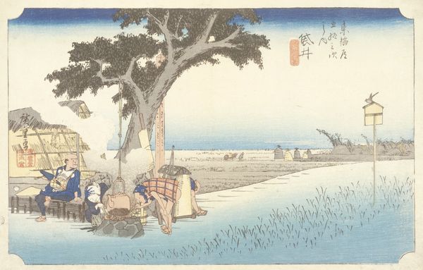 Utagawa Hiroshige crafted this woodblock print, "Theehuis in de Buitenlucht in Fukuroi," capturing a roadside scene steeped in Japanese culture. Dominating the composition is a large tree, a universal symbol of life, shelter, and connection. Observe the tree's form: it echoes the ancient 'axis mundi', the world tree found in various cultures, linking the earthly realm with the heavens. In Shinto, trees are often seen as dwelling places for spirits, lending this scene a subtle spiritual dimension. Consider its reappearance—from the Tree of Knowledge in the Garden of Eden to the sacred groves of ancient Greece—trees have been a powerful symbol across diverse epochs. This symbol reflects our collective unconscious, where archetypes of nature and life intertwine. The image engages us on a deep, subconscious level, reminding us of nature's enduring presence. The tree, therefore, is not merely an object but a vessel of cultural and psychological resonance, revealing how symbols resurface and evolve, connecting us to a shared, ancestral past.