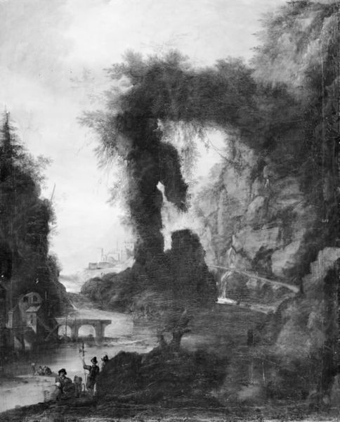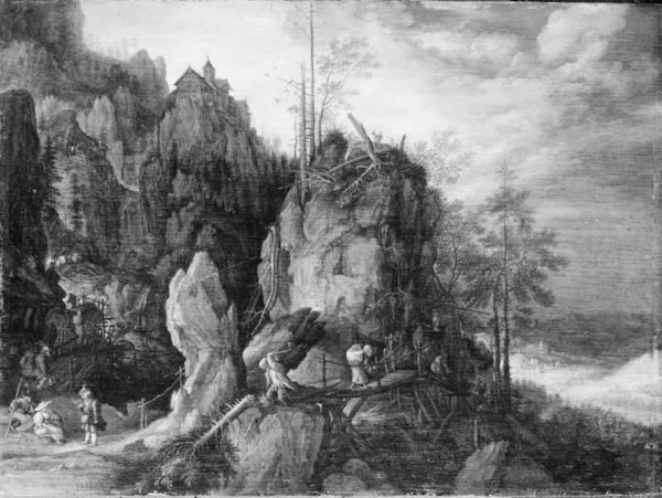 Pieter Stevens painted "Rocky Landscape with a Goat Hunt" using oil on canvas. Notice the dramatic interplay of light and shadow which dominates this monochrome vista. The composition is structured around a series of layered rock formations, creating a sense of depth and enclosure, drawing us into a scene of primal wilderness. The heavy chiaroscuro does more than just depict light; it creates an emotional terrain. This aesthetic links to the Mannerist style, which prized artifice and emotional intensity over naturalistic representation. The landscape isn't merely a backdrop, but an active participant in the drama, a stage where the hunt unfolds. Stevens uses the landscape to destabilize conventional meanings, suggesting that nature isn't just a backdrop to human activity, but a powerful force that shapes human destinies. In this work, Stevens asks us to reconsider our relationship to the natural world, prompting us to recognize the inherent power of the landscape.