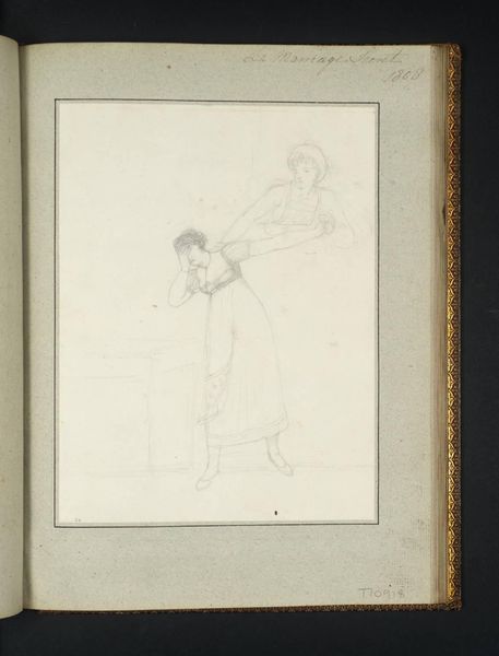 Editor: Here we have an untitled pencil drawing by Lady Wharncliffe, likely from around 1808. It depicts a woman with her hands covering her face. What strikes me is the sketch's vulnerability, laid bare by the artist's delicate touch. What do you see in its composition? Curator: The formal elements are quite revealing. Note the artist's handling of line: thin, tentative, yet conveying form and emotion effectively. Consider also the use of negative space around the figure, emphasizing her isolation. Do you observe how the composition draws the eye to the central figure? Editor: Yes, the framing does seem to isolate her further. I hadn’t considered the negative space so deliberately. Curator: Indeed. The artist’s choice to render the figure with such minimal detail invites closer inspection of line quality and spatial relationships within the frame. It's a successful demonstration of form dictating content. Editor: I appreciate how you've shown how the artist's technique and composition create this sense of emotional exposure. Curator: And I appreciate your willingness to analyze the pure form, which is often underappreciated.