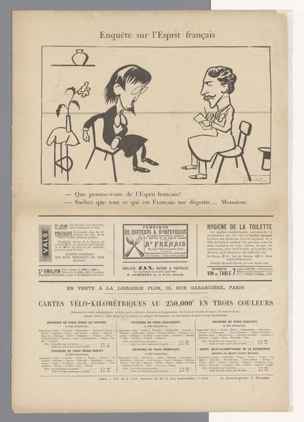 Editor: So, this lithograph is by Henri de Toulouse-Lautrec, titled *Footit and Chocolat*, and it’s from 1895. It's so raw, almost like a sketch straight from his notebook. I'm really struck by how dynamic it is, capturing movement and personality with such simple lines. What grabs you when you look at this? Curator: It's more than a sketch; it's a slice of Parisian life distilled through Lautrec's inimitable gaze. The way he uses line to capture the essence of Footit and Chocolat, these two performers, is pretty profound. Think about the context—this is the world of the cabaret, the circus, spaces where boundaries blurred. See how Chocolat is presented, this Black performer, in a way that's both celebratory and… something else. What do you make of their interaction, this almost violent push? Does it sit well with you? Editor: Well, there's definitely an uncomfortable tension there, isn't there? Chocolat is seemingly kicking Footit. It seems the dynamism and caricature are masking a more complex and potentially problematic dynamic. Curator: Precisely. Lautrec isn't simply documenting; he's presenting us with a relationship ripe with power dynamics and the anxieties of the time. It's about humor, but a humor tinged with social commentary, if not critique. Editor: So it’s not just a fun drawing; it’s making us think about race and class in 19th-century Paris. I hadn't really picked that up at first. Curator: Absolutely. Lautrec had a gift for embedding those social observations in what seems like simple illustrations. Every line he puts down feels deliberate, contributing to a deeper understanding. Now what would you do with this piece in a contemporary setting, and why? Editor: I see it as a challenging artwork; showcasing it today offers opportunities to spark conversations about representation, caricature, and historical context. I appreciate that your insightful explanation really opened my eyes to the complexity embedded within Lautrec's art. Curator: And you’ve hit on something crucial: the power of art to invite dialogue and challenge our perspectives. Keep questioning, and keep looking closely.