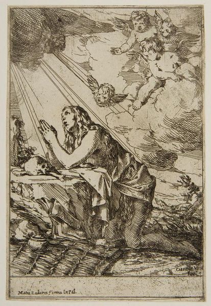Giulio Carpioni created this etching, "The Magdalen," sometime in the 17th century, and it now resides at the Art Institute of Chicago. The composition is dominated by linear, cross-hatched strokes that define form and texture across the print. The contrast between areas of dense hatching and sparse lines creates a dramatic chiaroscuro effect. This use of light emphasizes the emotional intensity of Mary Magdalen’s penitence. The upward gaze of the Magdalen, combined with the vertical lines of divine light, creates a visual pathway that leads the viewer's eye toward the heavens. This orientation implies a spiritual transcendence. In contrast, the skull and bare bones beside her symbolize mortality, a vanitas motif. The artist uses line and form to explore themes of redemption and the transient nature of earthly existence. The formal elements of the print underscore its symbolic weight, offering a rich visual meditation on faith and human condition.