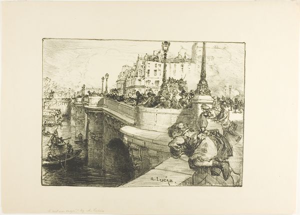 Editor: This is Pieter Dupont's "Schepen in het Damrak in Amsterdam," created around 1895 using etching and ink on paper. It's a captivating scene, very detailed, and evokes a real sense of bustling activity. The water especially catches my eye. What do you see in this piece from a formal perspective? Curator: Observe the masterful control of line. Dupont orchestrates a complex composition through variations in stroke weight and density, wouldn’t you agree? See how he creates depth. Notice, too, how the high horizon line compresses the pictorial space, forcing our attention onto the interplay between the architectural forms and the masts of the ships. Do you find this a successful strategy? Editor: It is! It makes the boats feel much more imposing, almost stacked. And now I see how the reflections on the water are actually a collection of smaller etched lines, each contributing to the overall texture. Did he vary the chemicals to get such different results or would that have come from timing? Curator: Possibly the duration in the acid bath or even the number of times the plate was bitten by acid. Now consider the use of light and shadow, which gives a structured but not entirely photorealistic description, a clear aesthetic choice by the artist. Editor: So the stark contrasts aren't necessarily true to life, but a deliberate technique? Curator: Precisely. They establish a visual hierarchy, guiding the eye through the intricate network of forms. It exemplifies a key interest of the period - pushing the boundaries of printmaking through the lens of personal expression rather than simply replication. Editor: I had been focused on the scene, but you've revealed a new appreciation for the artifice of the printmaking itself. It’s much more complex than it first appears! Curator: Exactly! And in dissecting that complexity, we begin to appreciate the artist's intention and technical mastery.