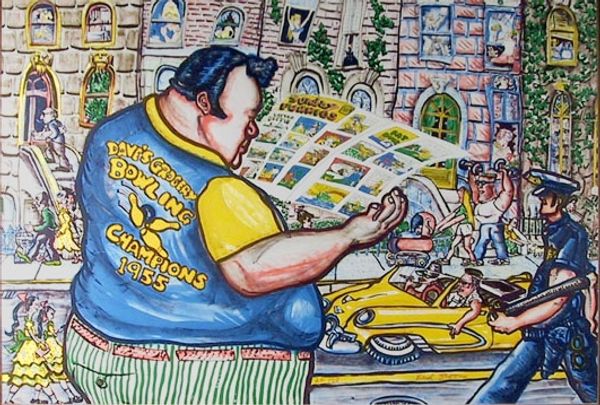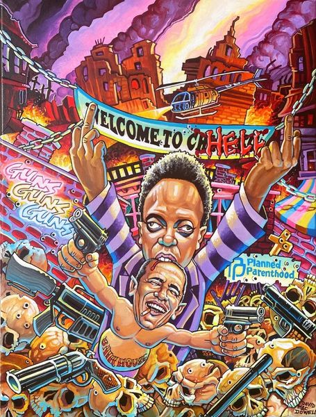 Dave Macdowell’s painting, *One Flew Over The Rainbow*, mashes up cinematic worlds to create a jarring critique of mental health institutions. It pulls from the fantasy of *The Wizard of Oz* and the gritty realism of *One Flew Over the Cuckoo’s Nest* to question authority and conformity. The artist uses familiar characters to explore themes of power, control, and sanity. We see Nurse Ratched as the Wicked Witch, her green skin signalling her malevolence. McMurphy stands in for Dorothy, his manic grin challenging the sterile environment represented by Emerald City, now the 'Mental OZipital’. Macdowell critiques the power dynamics within these institutions, revealing the fine line between care and control. The rainbow, a symbol of hope, is twisted into a sign for a mental hospital, suggesting that the promise of healing is often illusory. The mashup prompts us to consider how society defines and treats those deemed 'different', challenging us to resist easy answers and embrace the complexities of the human mind.