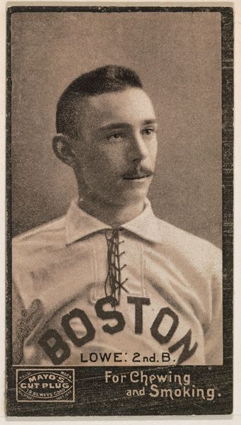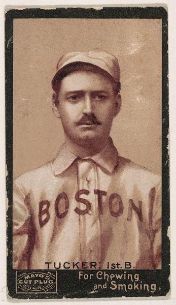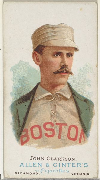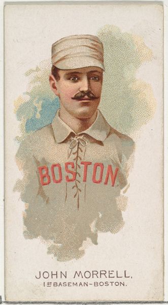 Curator: Well, isn't this just striking? At first glance, I sense an interesting duality, maybe a kind of innocent nostalgia mixed with old-world determination, like a tintype of a dreamy memory, you know? Editor: Indeed. What we're looking at is a lithograph created around 1888 by Goodwin & Company, titled "King Kelly, Catcher, Boston," from the Goodwin Champion series designed for Old Judge and Gypsy Queen Cigarettes. It captures Michael "King" Kelly, a prominent baseball player of the era. Curator: "King" Kelly, that's right! Now I can totally imagine myself watching an old baseball match while smoking one of those cigarettes—well, maybe just in my imagination. He looks confident, ready to jump off the card and catch a fastball for the camera, but it’s almost caricatured and certainly impressionistic. Does that make any sense? Editor: It does, actually. The lithographic process lends a unique aesthetic quality; you'll observe the subtle textures and dot patterns if you get close. They are crucial formal devices contributing to both realism and stylized portraiture—the sitter certainly posed with care. Observe his red necktie and light hat against that sky with clouds… The print also captures details of the period while idealizing him as an icon. Curator: The name “Boston” really pops, too, doesn’t it? And is that a laced neckline I spy there? Very sporty for the late 1800s, but the expression gives him a kind of a mischievous aura. And he does have a beautiful 'stache! It hints to a playful side that perhaps the photographer aimed to project... beyond his public image, I reckon. Editor: Precisely. It’s a balance between commerce and artistry. By embedding his portrait with signifiers—"Boston," the clouds, the brand insignia— the piece invites consideration. More importantly, I argue this aesthetic consideration elevates the player. In that time this work must have helped immortalize the legend! Curator: Definitely, I now see him larger than life—almost mythic, despite it only being a little trading card insert in a pack of ciggies! Editor: And that intersection – the mundane use for ephemeral publicity that created and amplified mythos for celebrity! Quite neat, huh?