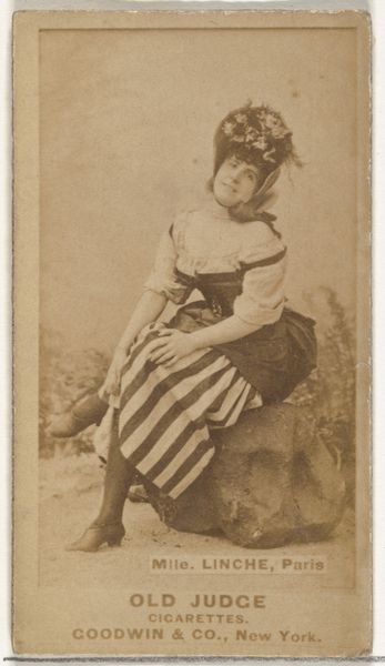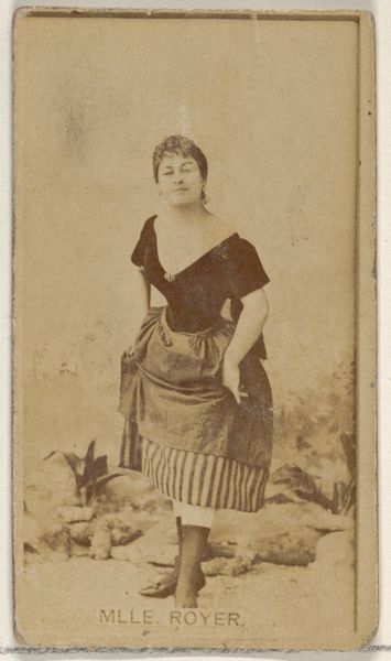 Editor: This is Card Number 343, Mlle. Zephiry, from the Actors and Actresses series, a promotional card for Cameo Cigarettes by Duke Sons & Co. from the 1880s, currently at the Met. It's striking how much detail they packed into such a small card. The layers of her skirt especially create visual interest. What formal elements do you find most compelling? Curator: Observe how the photographer contrasts the rigid vertical stripes of the subject's skirt against the soft, organic forms in the backdrop. This tension is further heightened by the composition itself. The model, Mlle. Zephiry, occupies the right side of the frame, countered by the mass of foliage on the left, resulting in dynamic equilibrium. Editor: It's like the formal wear, being rigid, is placed among an artificial nature, quite staged. Is the backdrop photograph or drawn? Curator: Note how the tonal values of the backdrop, particularly the blurred foliage, lack crisp definition. This lack of resolution is a deliberate effect, a softening, that allows the sharper lines of the subject to assume focal primacy. I'd argue that this conscious arrangement reinforces the artifice inherent to studio portraiture, specifically in commercial prints. Is there anything you notice in her attire that could suggest performative qualities? Editor: Her elaborate costume stands out, even her stance looks rather unnatural. I now see that she appears less as a person and more as a crafted image. Thank you. Curator: And thank you, for pointing out the interplay between constructed and authentic, prompting us to consider the nuances of representation.