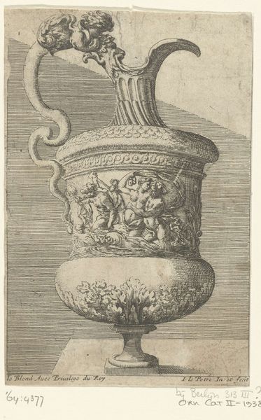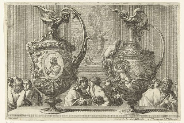Editor: We're looking at "Two Ewers" which the Rijksmuseum dates to before 1742. It's an anonymous engraving print. The thing that grabs me immediately is how these enormous ewers, these pitchers, absolutely dominate the scene, dwarfing the people. What do you see in the stark contrast between the objects and the people? Curator: Indeed, the disjunction in scale is immediately striking. Note how the artist deploys line—its varying thickness and density—to articulate depth and volume. Observe, too, how the symmetry of the overall composition is carefully disrupted, directing the eye across the picture plane, a dialogue between stasis and movement. Consider the relationship of each component of the composition in creating balance. Editor: So, you’re saying the imbalance itself creates a kind of…dynamic tension? Curator: Precisely. Consider the texture conveyed by the intricate engraving. Can you trace how the artist varies the texture through differing application and mark making? It contributes to the composition’s visual intrigue and inherent tension, as you keenly noted. It also directs how the available light reflects. What function could these reflections have for the viewers? Editor: I hadn’t thought of it that way. Looking at the play of light and shadow, it definitely makes it feel more three-dimensional. Thanks, I’m viewing the whole picture differently now, realizing how everything within its borders has impact. Curator: I'm delighted to have shared this perspective. Every formal decision holds the potential to reframe how we perceive a work and question its impact on us.