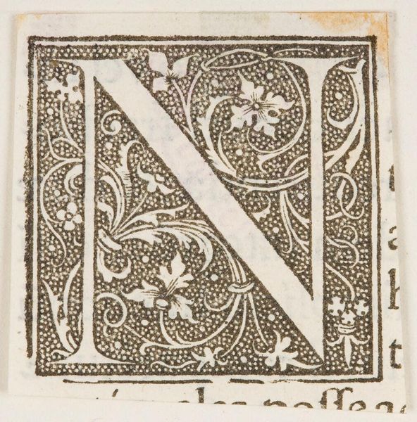 Curator: This image presents an initial "I," artist unknown, currently residing in the Harvard Art Museums. Editor: The density of detail packed into such a small space is striking. It feels weighty, almost monumental, despite its probable diminutive scale. Curator: Precisely. Note the texture created by the stippled background against the stark white of the letterform. The contrast lends the "I" visual prominence. Editor: And those serpentine dragon heads intertwined with the foliate designs...they immediately conjure up images of illuminated manuscripts, a sense of the sacred and the authoritative word. Curator: The graphic nature suggests this "I" may have been used as a printing element. Editor: The image evokes a lost world of craftsmanship and painstaking labor. It makes me wonder what text this initial "I" once introduced. Curator: A fascinating detail to contemplate as we consider its formal qualities. Editor: Indeed. Every detail tells a story, real or imagined.