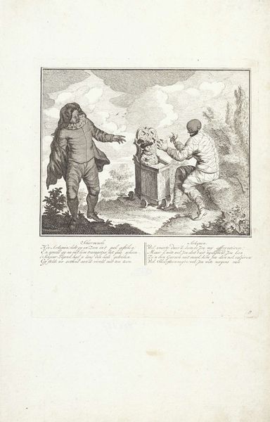This print, titled ‘Piro houdt de kleine Arlequin aan de leiband,’ was made anonymously using an engraving technique. The stark contrast between the dark lines and the light paper is what gives the image its form. The engraver would have used a tool called a burin to carve lines directly into a metal plate, likely copper. Ink is then applied to the plate, and wiped off the surface, leaving ink only in the incised lines. The plate is pressed onto paper, transferring the image. The image's power resides in its depiction of social hierarchy. It's difficult to ignore the way the scene portrays power dynamics through the figures and their relationships. The labor involved in producing the print is a stark contrast to the social relations it depicts. Ultimately, understanding this print requires acknowledging both the artistry of its making and the social context in which it was created and consumed. This reminds us that even seemingly simple images can carry complex cultural meanings.