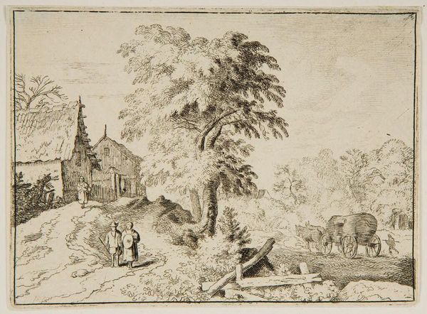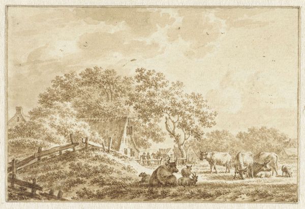 "Enspijk bij Leerdam" was created by Pieter Jan van Liender, likely in the mid-18th century. It’s a drawing characterized by delicate lines and a subdued palette of sepia tones, giving the scene a sense of historical distance and tranquility. Van Liender masterfully uses composition to guide our eye through the landscape. The buildings, trees and figures are carefully arranged to create a balanced yet dynamic scene. Note how the perspective flattens the space, almost abstracting the landscape into a series of planes. This flattening effect serves to emphasize the surface of the drawing itself, drawing attention to the materiality of the artwork. The drawing offers a glimpse into the 18th-century Dutch countryside, but it also invites us to consider how we construct meaning through visual representation. The formal qualities of the drawing—its line, composition, and tone—shape our perception and understanding of the scene. It underscores that art is not simply a mirror reflecting reality, but an active agent in shaping our understanding.