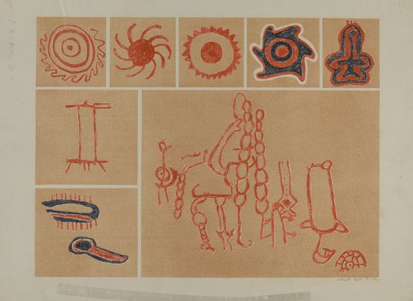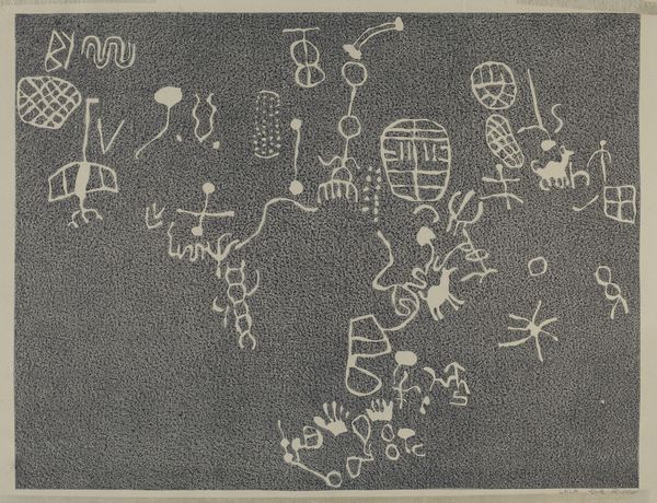 Lala Eve Rivol created this petroglyph on paper to replicate ancient rock carvings. Here, the radiant sun, a universal symbol of life and energy, dominates the composition. Note how its rays extend outwards, a gesture reminiscent of ancient Egyptian sun disks, representing divine power and cosmic order. But here, they are surrounded by other images such as animals and human-like figures, indicating the importance of the natural world. Consider also the repeated motifs of human figures: their stances, with arms raised or joined, echo the 'orant' figures found in early Christian art, embodying prayer and supplication. What does it mean for them to be placed together? The symbols speak to our collective memory, echoing a primitive urge to record, communicate, and connect with the cosmos, and the emotional weight of these connections, etched in stone and now on paper, continues to resonate. This art is a testament to the cyclical nature of human expression, where ancient forms resurface, carrying echoes of past beliefs into the present.