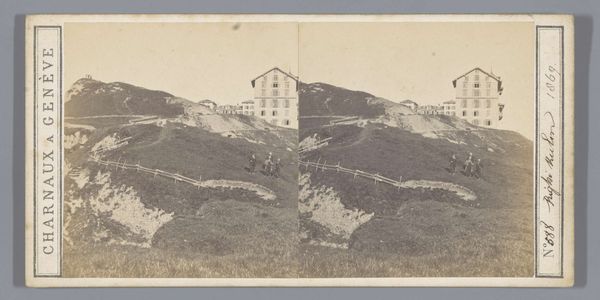 Editor: We're looking at "Landweg leidend naar een dorp, vermoedelijk in Spaans Baskenland," taken in 1904. It's a photograph by Delizy and it really evokes a feeling of quiet stillness, like a forgotten corner of the world. What do you see in this image, from a historical perspective? Curator: Well, this photograph, while seemingly a simple landscape, offers insight into the societal values and aesthetic movements of its time. It reflects the growing interest in rural life and the picturesque, partly a response to rapid industrialization in other parts of Europe. Editor: That makes sense. So the focus on the rural Basque region isn't just a random choice? Curator: Precisely. This choice would probably serve as a symbol of national identity and tradition amidst socio-political change. Do you see how the composition guides your eye into the distance, almost as if beckoning a return to the simplicity of life? It might serve to create a sense of romanticism, appealing to city dwellers seeking an idealized version of rural existence. What do you think? Editor: I didn’t consider it that way at first. The receding road and the high horizon give the buildings more importance now that you mention it. Is it like a documentary then, but with a message? Curator: One might describe this as social documentary—not merely capturing reality, but conveying messages and values associated with social identity through imagery. The inclusion of what seems like laborers traveling, for instance, becomes a potent image that influences the contemporary imagination. Editor: That’s given me a lot to think about. Now I see more depth within its serene façade. Thanks for expanding my understanding of how photos can reflect their context. Curator: My pleasure. Seeing art within a cultural landscape truly deepens our understanding and opens new pathways.
