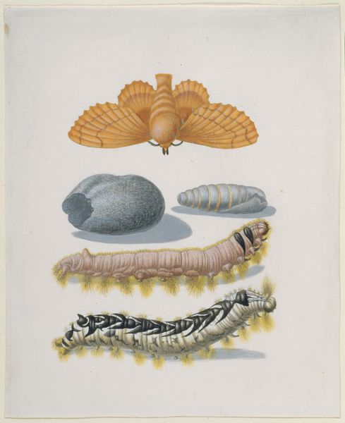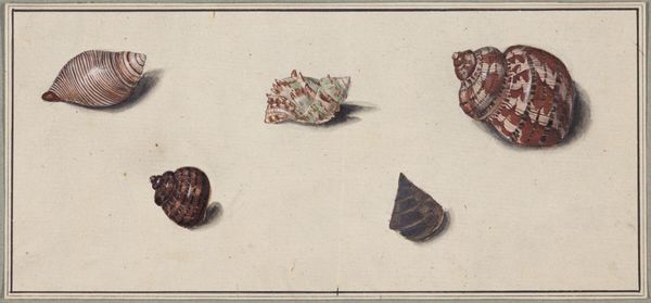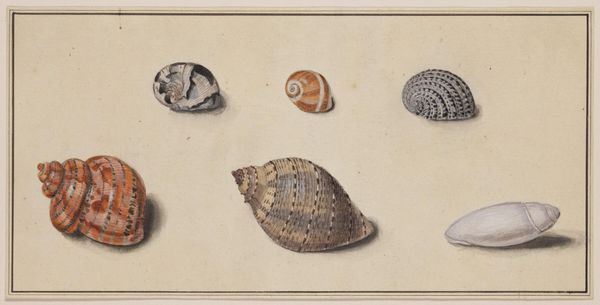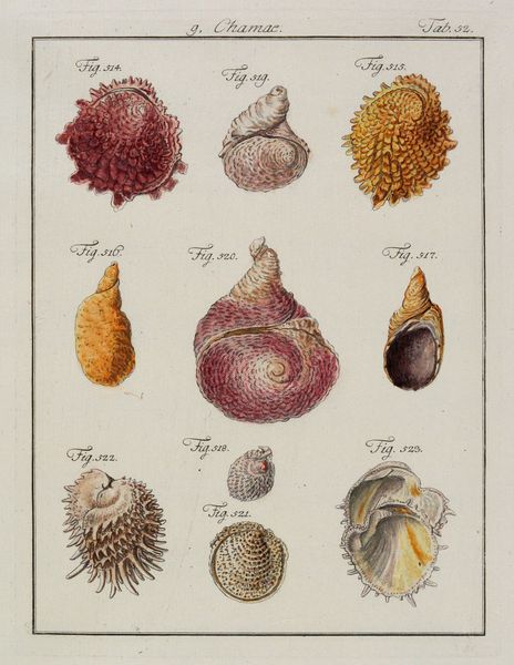 Editor: Here we have Plate V from "Choix de Coquillages et de Crustacés", created in 1758 by Franz Michael Regenfuss. It looks like a watercolor print, neatly depicting different seashells. The composition feels very scientific, almost like a catalog. What catches your eye in this work? Curator: The sheer act of rendering these shells with such precision during this period speaks volumes. What tools were available? How did Regenfuss achieve such detail? The shells themselves were commodities, collected and traded. Their depiction highlights both natural beauty and economic value. Consider the pigments used – were they locally sourced, or exotic imports? Editor: That’s a really interesting point, the link to trade and resources. I hadn’t thought about the economic aspect. It makes me wonder who was commissioning and consuming this type of art? Curator: Exactly. Who had the leisure and resources to collect shells, commission such detailed illustrations, and acquire the prints? It points to a privileged class with access to global trade networks. The shells aren’t just objects; they represent power, consumption, and the control of resources. Notice, too, the standardization inherent in scientific illustration; what purpose does that serve? Editor: So it's less about the shells themselves and more about what they represent in a socio-economic context. The means of creating this, the resources involved… it really shifts how I view this piece. Curator: Precisely. We can look beyond the surface beauty and consider the layers of meaning embedded in the materials, production, and circulation of these images. It changes our perspective entirely, doesn't it? Editor: Definitely! I'll never look at a pretty shell the same way again! Thanks!