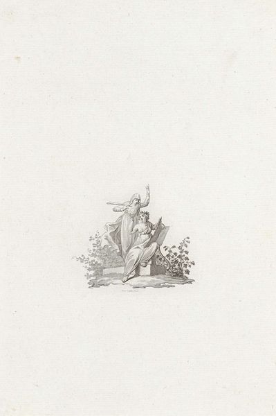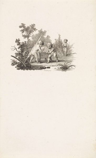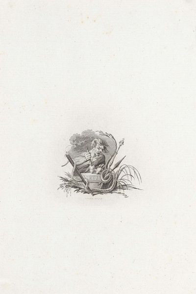 Curator: This engraving, currently held in the Rijksmuseum, is entitled "Vignet met de Dood en een putto" which translates to "Vignette with Death and a Putto", crafted between 1751 and 1816 by Reinier Vinkeles. The contrast is immediate, isn’t it? A stark black and white composition. Editor: Indeed. Death and a putto... quite the juxtaposition. I'm immediately struck by the technical skill though. The clean, precise lines of the engraving give it such a delicate, ethereal quality. The texture created, almost a velvety smoothness juxtaposed with jagged skeletal details. The paper itself becomes part of the art. How would it have felt to create this, tool in hand, the careful control over material? Curator: Let's dive into the imagery. We have a skeletal figure of Death, seemingly emerging from a cloud, offering a laurel branch – a symbol of victory or peace. And then the putto, representing innocence and life, reaching out. The tension here speaks volumes. What could this imagery mean? The putto touching death? Editor: To me, that skeletal form offering a branch becomes interesting when thought of alongside others that made prints like this. It begs questions around workshop production methods. Is this paper the best choice? Who would have bought and consumed this? The final price point matters hugely when you understand this sort of work! And, while you see the imagery and consider innocence meeting death, I am more preoccupied with how this was consumed materially, daily, within the walls of its new home. Curator: Ah, yes, and that would affect its cultural reading. The putto is such a prominent figure in baroque art. It is frequently linked with religious concepts of life and love. Could this image then, represent hope emerging, even in the face of mortality? The skeleton offering the branch instead of striking, almost seems merciful. Or maybe that death is but a path into rebirth? Editor: Or maybe the availability of paper and ink drove these images? Perhaps the material constraints – the limitations of engraving – drove the simplicity and created opportunity for sales and distribution of this art as object, not just as ideal? I feel so connected to its construction by viewing art this way! Curator: I find it intriguing how you can consider material first while, for me, the human narrative, told through symbolic languages that developed over millennia, comes so forcefully into view. Ultimately, it seems we are looking at the very definition of the fleetingness of life and the endurance of symbolic image itself in a world of material transience. Editor: Precisely. By considering its creation we are able to have a material understanding and see that fleeting moment still preserved thanks to material existence, long after Vinkeles' hands last touched the paper.
