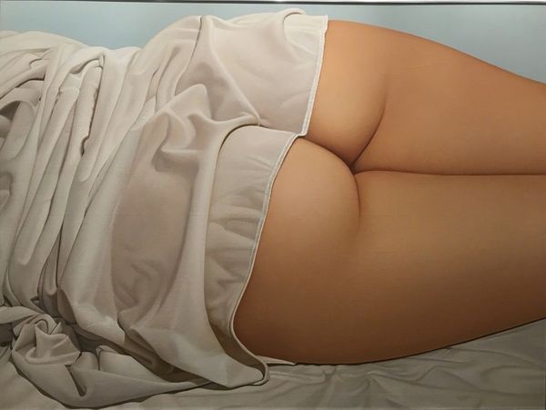 Curator: The work before us is an "Untitled" painting by John Kacere. Kacere was known for his hyperrealist style. Editor: My first impression is…provocative. It's such an intimate, almost clinical fragment of a body. The textures – the satin robe, the smooth skin, the lacy undergarment—are all rendered so meticulously. What kind of cultural coding is embedded here? Curator: The painting plays into several symbolic registers, doesn't it? The rose-tinted color palette, the luxurious fabrics, even the woman's posture – they all speak to notions of beauty, femininity, and perhaps vulnerability. One wonders what sort of archetypes or cultural memories are evoked for the viewer? Editor: Yes, it is fascinating. To achieve this hyperreal effect, I imagine that he made extensive preliminary studies, the careful layering of paint to build the subtle shifts in tone. It has the sleek, detached aesthetic of commodity culture that was happening around that period in the Pop Art movement. How is the female form presented for consumption and desire? What materials could elicit the right surface texture and sheen? It all contributes to the piece's specific aesthetic and statement, or lack thereof. Curator: I agree. It is both there and it is absent. The female form, historically and symbolically charged, reduced to its metonymy. One has to wonder the artist's intentions. Editor: Maybe the very intent of the image lies in questioning our conventional associations around such iconography, highlighting the objectification inherent within art traditions. What happens when an artist reproduces existing imagery versus when the viewer observes a work with its references in tow? Curator: Absolutely. These objects and their construction carry histories, assumptions, anxieties that each viewer must negotiate as they gaze upon its details. It seems Kacere's pieces remain strikingly complex when thinking about memory and identity. Editor: Agreed. Kacere has left us to consider not just the aesthetic surfaces, but the web of historical and social connections they bring to light.