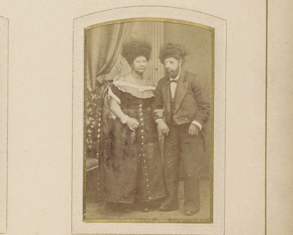 Editor: This is a fascinating portrait! "Portret van het echtpaar De la Tour Manbourg," possibly from 1861, is an albumen print photograph by Mayer & Pierson. I'm really struck by how stiff and formal the composition is, even though the couple are posed quite intimately. What do you see in this piece? Curator: The photograph's power lies in its precise calibration of tone and texture. Consider the man's trousers. The eye is immediately drawn to the tension between the smooth dark surface of his jacket, against the intricate patterns of his pants and the softness of the furrows on the backdrop behind him. Editor: I hadn't really noticed the contrast in textures so much! The framing of the subjects adds to that contrast too, don't you think? Curator: Precisely. Note how the artist positioned the subjects and the subtle blurring effect – seemingly to focus attention on the sitters as objects in themselves rather than any representation of narrative. Editor: Interesting. Do you think the tonal qualities are unique for the time this photo was taken? Curator: Early photography like this faced inherent limitations in capturing tonal range, but artists used such limitations to enhance visual strategies such as balancing light to create shapes. Editor: So, you're saying that focusing on tonal balance allows one to interpret it as purely formal experiment in and of itself. I suppose in that way, its historical setting doesn't change much in terms of its artistic value, right? Curator: The beauty here exists within its constructed pictorial space and its formal arrangement. Regardless of outside cultural understanding, the focus rests primarily on this. Editor: That's fascinating, looking at it purely as an exercise in shape, form, and balance. It shifts my whole understanding! Curator: Indeed. A focused attention to the internal mechanics of form yields profound results.