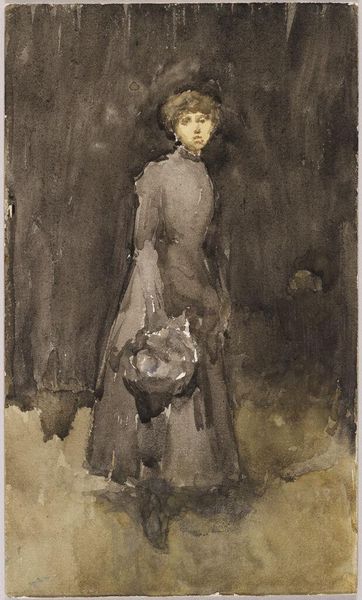 Curator: Before us we have John Singer Sargent's "Breton Girl with a Basket, Sketch for ‘Oyster Gatherers of Cancale’," dating from 1877. Editor: It strikes me immediately as a study in transient light and shadow. The almost monochromatic palette emphasizes the form, but there’s also a prevailing sense of melancholy about it. Curator: Indeed. Sargent was fascinated with capturing fleeting moments. He uses broad, confident brushstrokes to define the girl's form, a visual technique emphasizing a palpable sense of movement. I am curious: do you notice the use of the negative space around her? Editor: The composition does feel unfinished, yet deliberately so. The emptiness surrounding the figure amplifies the girl’s isolation, maybe even a quiet resilience born of the demands of her labor. There is quite a stark contrast with Sargent’s later society portraits and more celebrated works. Curator: The image's power, in part, resides in its understated portrayal of working-class life in 19th-century France. Consider the context: Sargent’s painting coincides with increasing industrialization across Europe. These changing socioeconomic conditions elevated attention, visibility, and even anxiety toward the laboring class. Editor: It makes me wonder about the ethics of depicting the working class, if such glimpses did any more than provide visual interest. Sargent's portrayal of the Breton girl is both beautiful and somber. Her averted gaze and posture suggest introspection. And it appears this was not Sargent's intention. Curator: Do you mean the image serves to aestheticize the harshness of everyday struggles? Perhaps. Still, this painting provides viewers an entryway into imagining her life, even inviting critical examination of their relationship to this history. And on the compositional level, Sargent manages to convey all this while adhering to key compositional guidelines of the time. Editor: Well, even with my reservations about its socio-political implications, I concede there is also much aesthetic pleasure to be had from this quiet depiction. Curator: A sentiment I appreciate. Ultimately, Sargent's study urges us to look both outwardly at the world and inwardly at ourselves. Editor: I think I leave this observation with a greater interest to visit the final work for which this serves as a preparatory study, so as to place it better in its intended context.