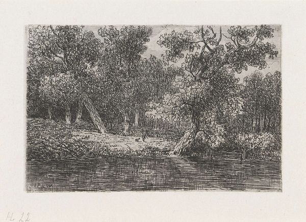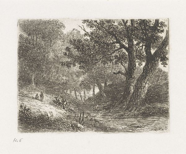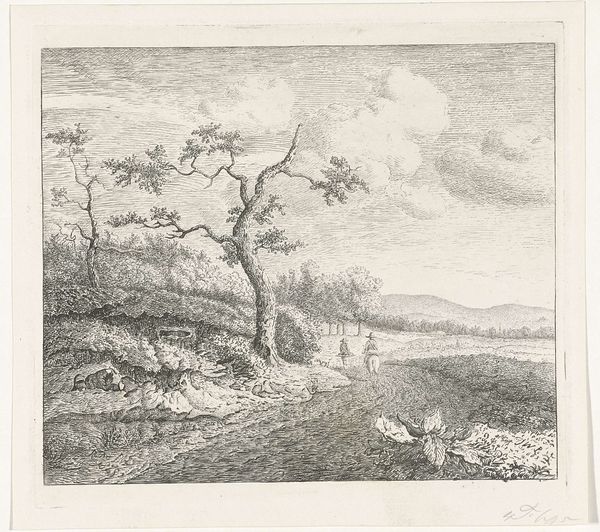 Curator: This etching, titled "Twee personen op een landweg" or "Two People on a Country Road," is attributed to Johannes Pieter van Wisselingh, dating from 1830 to 1878 and is located at the Rijksmuseum. Editor: It’s remarkably simple at first glance. Monochrome, clearly landscape-oriented. I find it somewhat melancholic, possibly due to the limited tonal range or the stillness of the figures. Curator: The technique here is key; notice how van Wisselingh used etching to create texture and depth. It seems that the artist was inspired by plein-air painting practices, as the natural light bathes the scene in an even, pastoral glow. I think it suggests a particular relationship between man and his surroundings, both humble and beautiful. Editor: Absolutely. The composition guides our eyes – the road leading toward that humble cottage, flanked by those grand, looming trees. Consider the lines themselves – thin, dense, economical. Note, however, the rough etching marks near the treetop that almost look like clouds, which may provide emphasis of the trees' hight and dominance within this setting. What materials were available to an artist at that time must surely have limited their range and production as well? Curator: The etcher's labor here tells an important story too. Producing work for the middle classes during this period created its own distinct genre; how prints were both commodities and art objects is an issue with cultural significance. Wisselingh clearly understood what patrons wanted, and successfully captured a popular taste for the Romantic style. Editor: I agree. Romanticism absolutely emerges in this somewhat sentimental scene. The road and tiny people do evoke a sense of solitary journey. Though on the surface the artist adheres to many stylistic qualities of Romanticism, by imbuing it with such minute detail van Wisselingh hints at the style of Realism, or perhaps even Naturalism. Curator: Realism is indeed present, but Wisselingh never ignores his romanticist inclination. Even with the presence of two figures, you cannot help but consider what life was like during those tumultuous periods when such objects had value within rapidly changing cultural economies driven largely because manufacturing. Editor: Interesting, how focusing on lines and composition alone helps me connect more profoundly with its historical underpinnings. Curator: For me, reflecting upon labor within such historical circumstances offers important social context to consider along with form.
